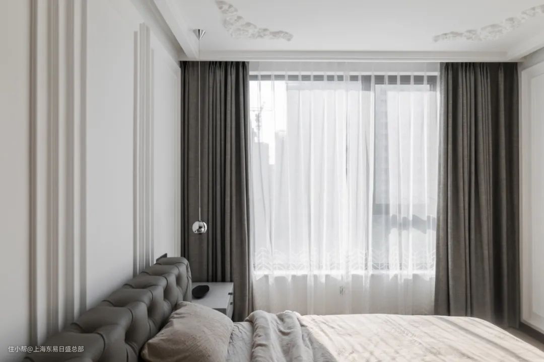 卧室空间以白色为基调,防水乳胶漆涂刷墙面及吊顶,利落的墙面石膏线与精致吊顶装饰,让整个空间利落而不失浪漫。卧室没有做主灯,避免躺在床上时,光线过于刺眼。隐藏式灯带嵌入在吊顶两侧,搭配线性床头灯,打造温馨柔和的光线。