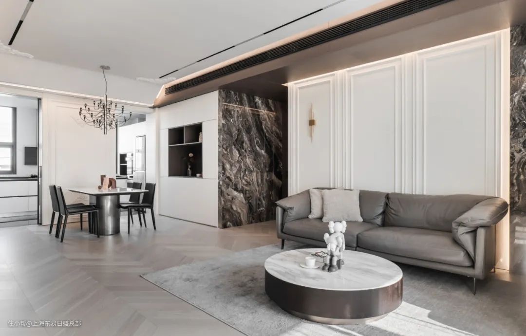 客餐厅两个空间连贯一体,保证利落舒适的视觉感受。石材、木材、金属与皮质的交织,共同营造了一个质感丰富的空间。