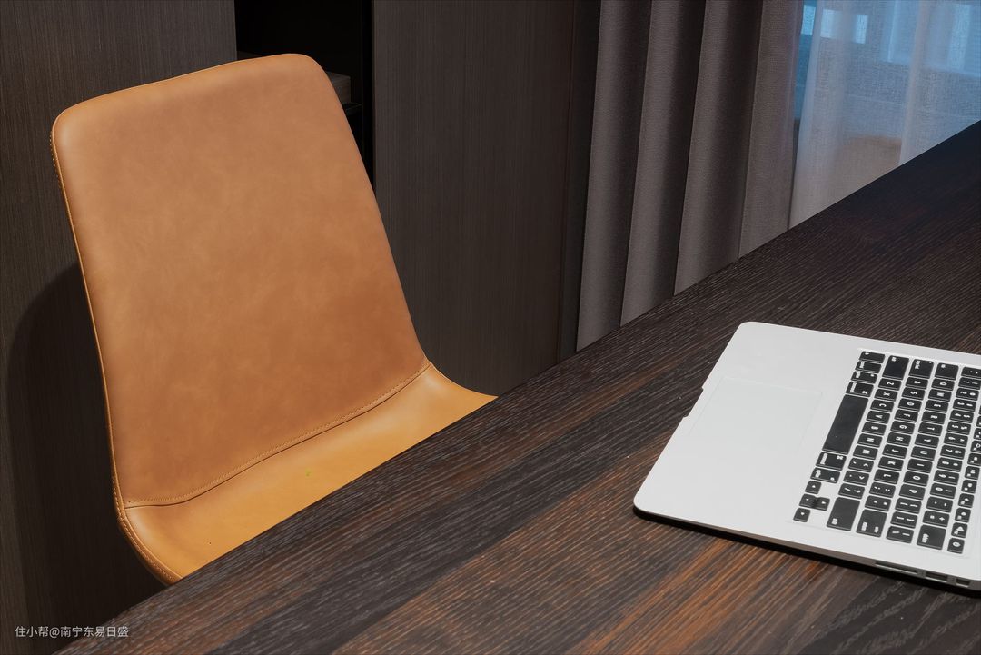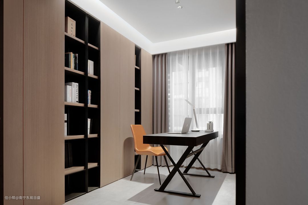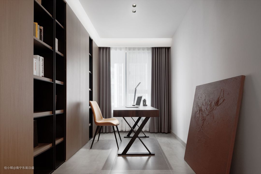 书房运用了深色系的原木色系,一张桌子,一张橙色的椅子搭配上深色的原木定制柜子,这样的搭配一切都恰到好处,不显得突兀反而简简单单的更能突出空间的高级质感。
