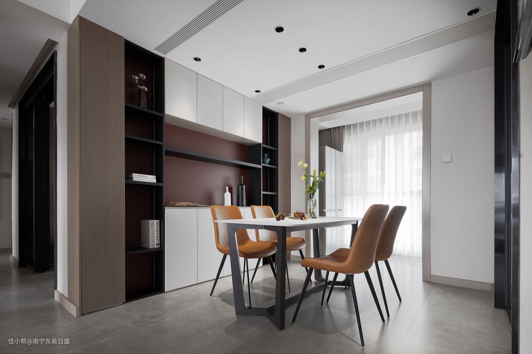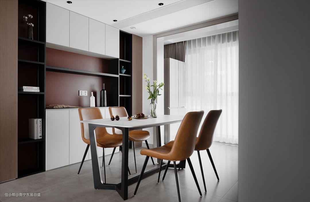 餐厅简约设计,更多注重功能,承载柴米油盐酱醋茶的人间乐活。值得一提的是定制的餐边柜餐桌轻盈灵动的姿态中和了大理石桌面的分量感,皮咖色的餐椅也配合的恰到好处。