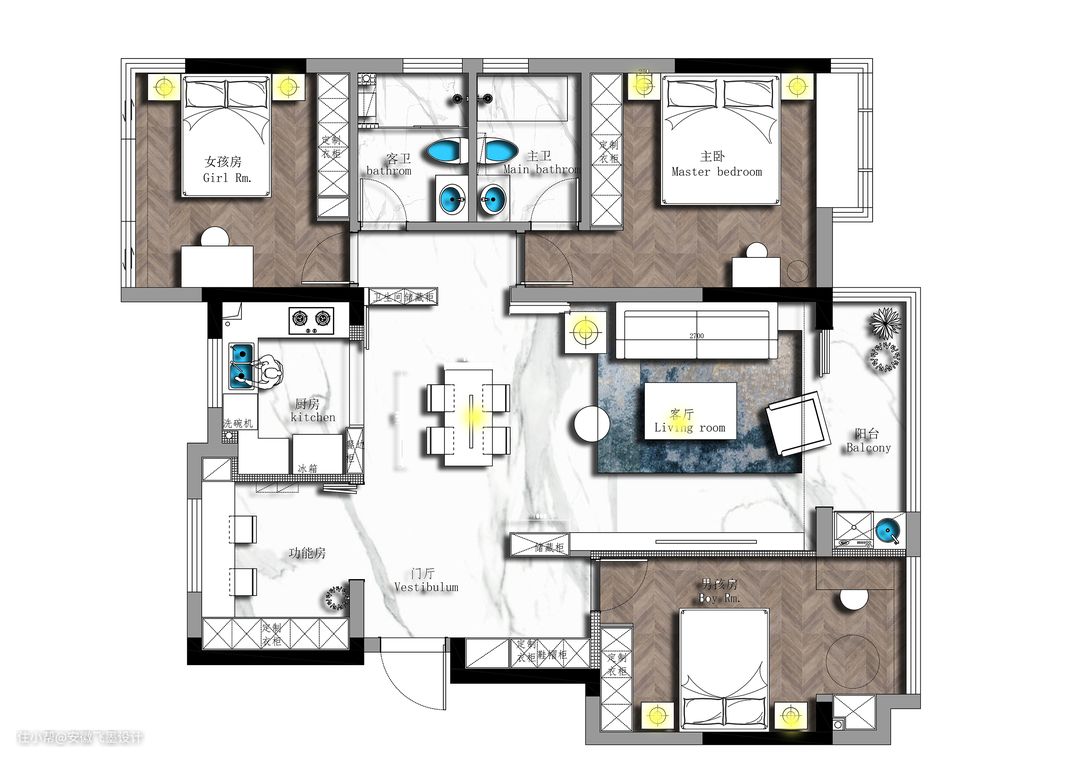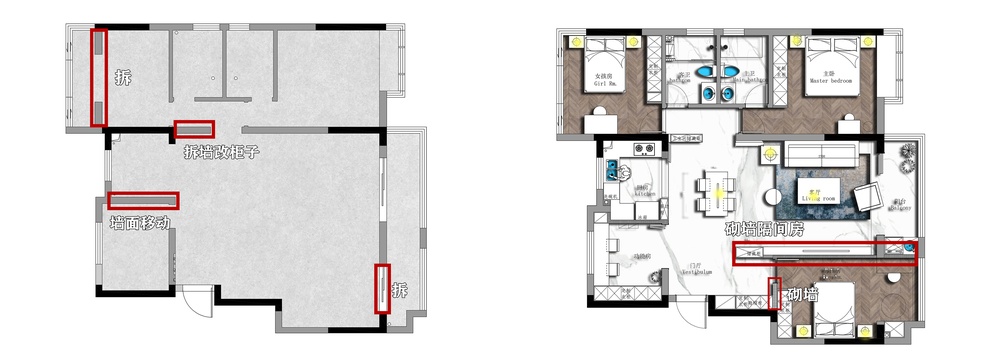🏠屋主故事 新房装修除了讲究美观和实用外,人情味也很重要,忽略了家人之间的互动也不算是成功的。 本套案例是一套改善型住宅,所以业主更注重于家的舒适感,男业主是商人,女业主做文职类工作,两人还有一儿一女,对新家的期望就是想要个舒适的家庭氛围。 对于新房的布置,男女业主都表达了自己的想法: ·两个孩子的玩具比较多,收纳空间一定要充足,也希望能培养孩子乐于收拾的好习惯; ·另外在房屋规划上,一定不能忽视全家人在一起互动交流的功能; ·而且房屋设计布局不光要考虑到全家人的生活习惯,还有对两个孩子未来成长需求的规划,打造一个“可生长”的家! 🏠功能设计前后: