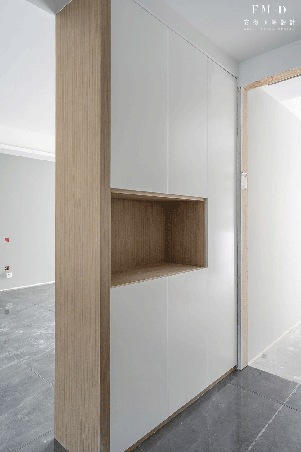 原本房屋结构进门就是客餐厅,一来没有空间设计玄关柜,二来私密性也差。考虑到居住的舒适度与便捷度,我们利用入户门右侧的凹型角落嵌入鞋帽柜,增加玄关收纳功能。 另外还将电视背景墙延伸出一部分设计玄关柜,避免入户见厅的尴尬。整体形成二字型布局,视觉上有种步入式衣帽间的感觉,入户更有仪式感。