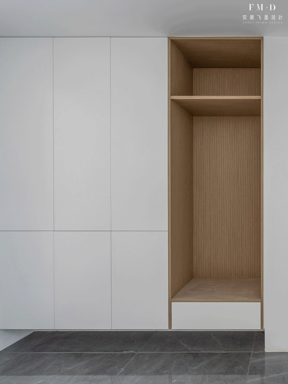 右侧玄关柜(长2米1,高2米4)一半作为鞋帽柜,另一半设计换鞋凳,底部增加抽屉可以收纳鞋套和鞋油这些小物件,柜子侧边还隐藏一面可旋转穿衣镜,功能十分的完善。 左侧的储物柜分成三段式,上下全是鞋柜,中间的凹槽区域方便随手小物件的收纳,像现在出门必须的口罩,就可以收纳于此,出门拿取也方便。