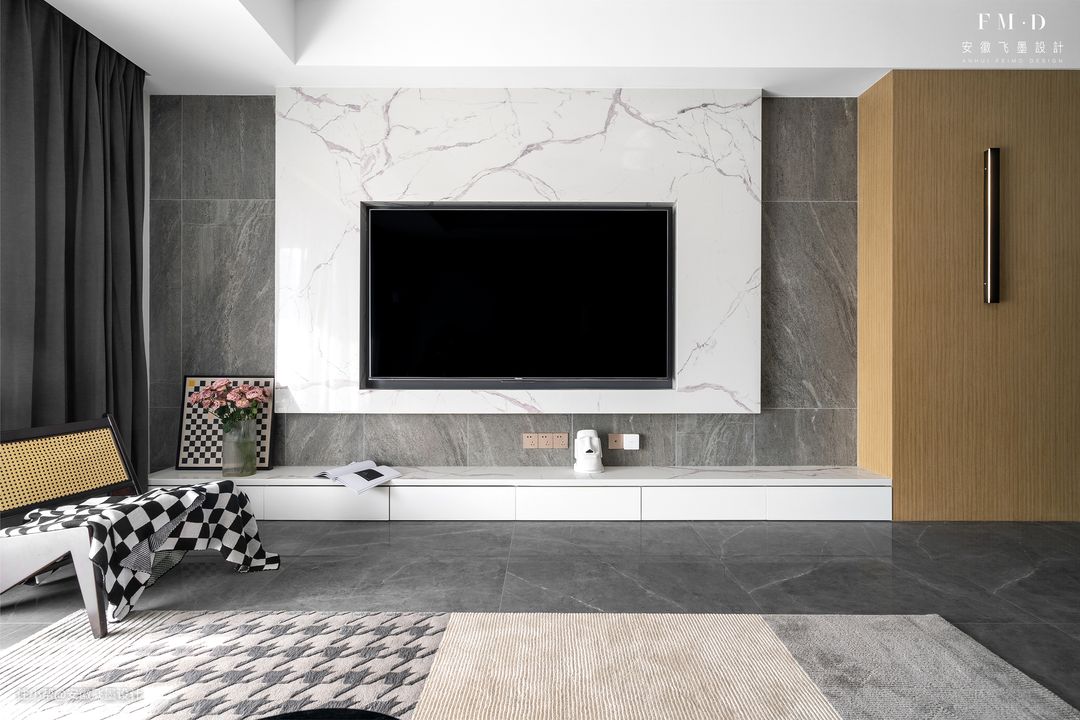 电视背景墙(长3米4)中间干挂石材然后将电视嵌入其中,底部再增加一排抽屉,解决客厅的基础收纳,看起来实用又大气。