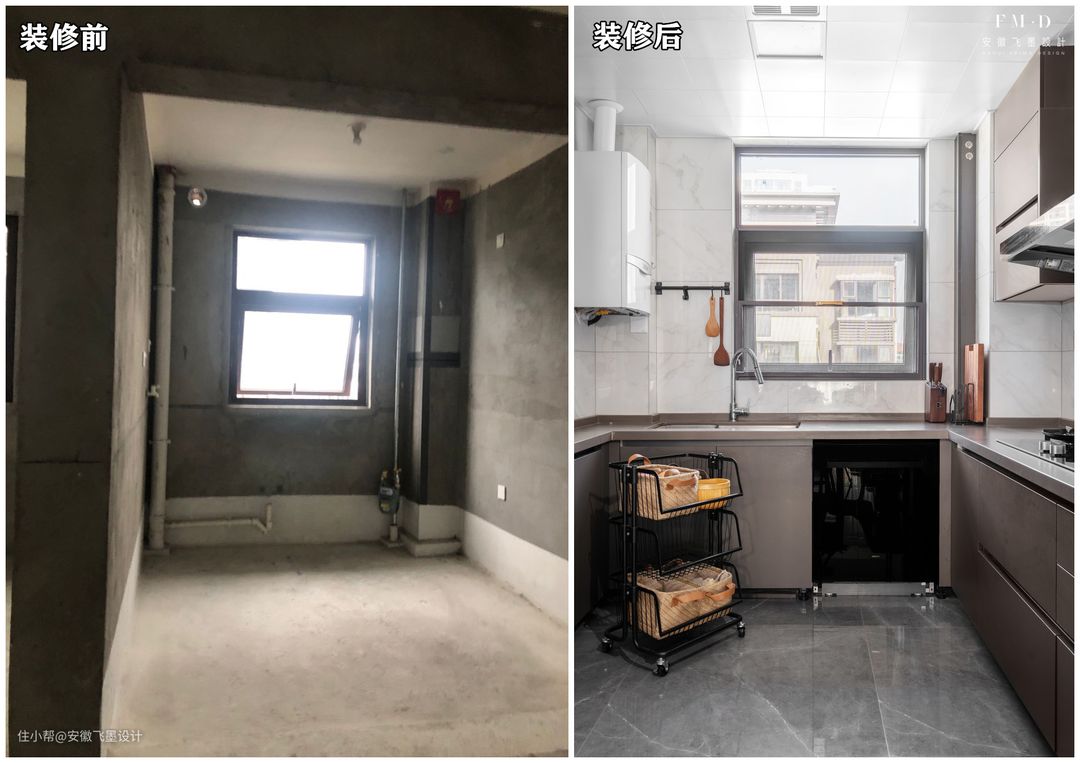 厨房原始格局没有问题,唯一的缺点就是空间小,为了给业主一个敞亮实用的厨房,将一侧的非承重墙往外挪动50公分左右,借用了一部分隔壁多功能房的空间,延伸橱柜台面,将冰箱也放置在厨房里。