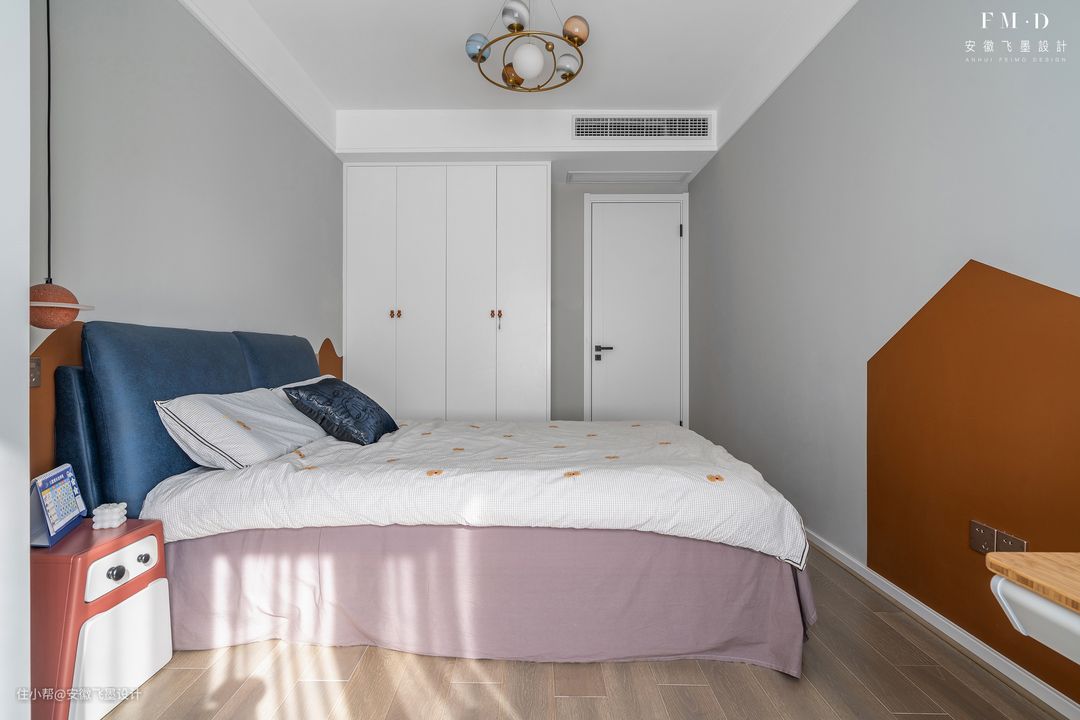 女孩房主要以粉色系为主,简洁明快又少女心,床头左右分别摆放床头柜和书架,方便睡觉前讲讲故事。床尾处同样也有一张书桌,等以后女儿大了也能满足梳妆的需求,空间感不大,但舒适度满分。