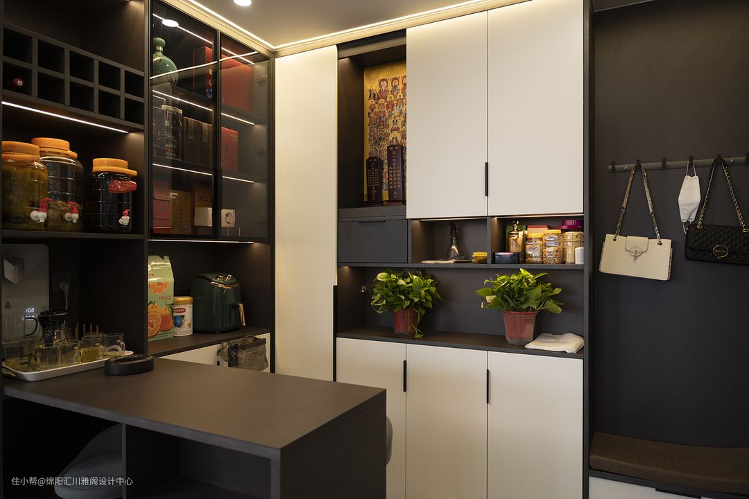 在这里玄关处不仅仅只是美观,设计师在此处特别设置了一个家用小吧台,来个朋友可以作为品茶区域,平时可以当作一个小型的餐桌。根据生活需求设置壁挂一体净水机,健康也方便。而设置一排挂衣架,每天出门时整理自己,轻松面对新的一天。