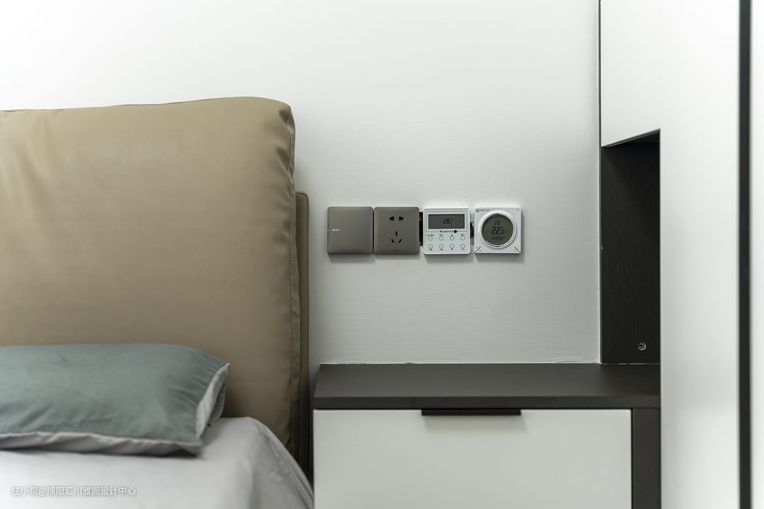 次卧为极简的白色,米黄色简约床,简单又耐看。单边床头柜与定制衣柜融为一体,衣柜容储量大,浅灰色窗帘调整屋内的温和度,在这里生活也被装满。