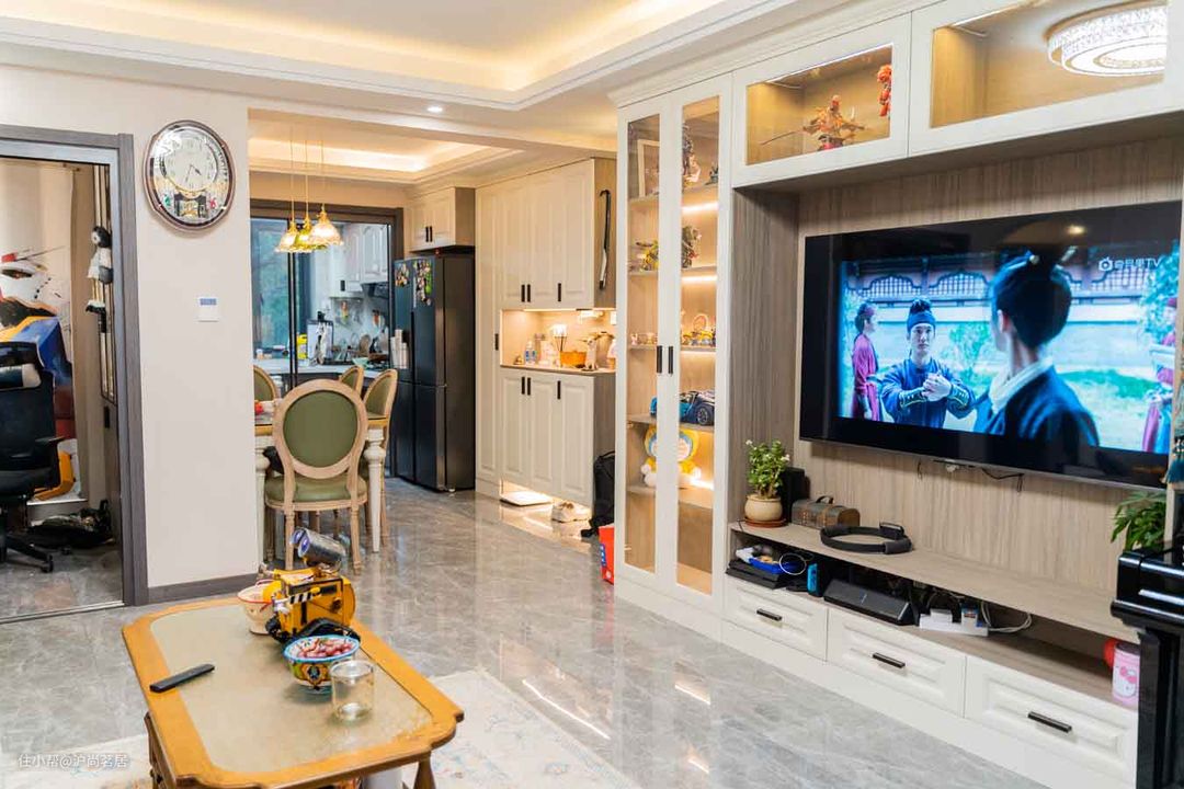 翁女士家常住人口为2-3人,因此直接将餐桌一侧靠墙处理,不影响日常动线。墙面做成嵌入式收纳柜,充当餐边柜功能。