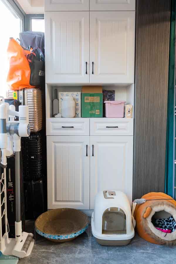 阳台另一侧是通顶储物柜,与此同时猫咪的小窝也放在了这里~