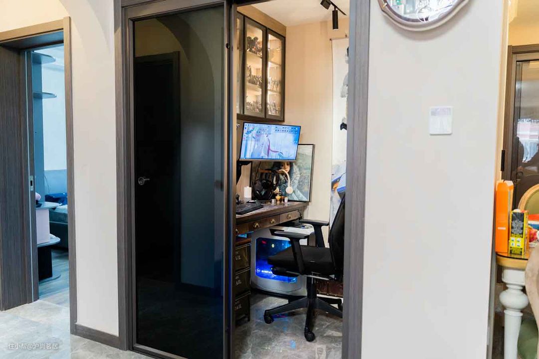 小书房门打开的样子,利用黑色玻璃移门对空间进行隔断,打造男主人的专属办公空间。