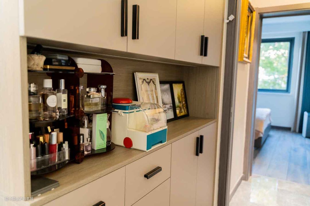 步入主卧,映入眼帘的首先是一个通顶定制柜,女主人很多的香氛、化妆品都存放在这里~