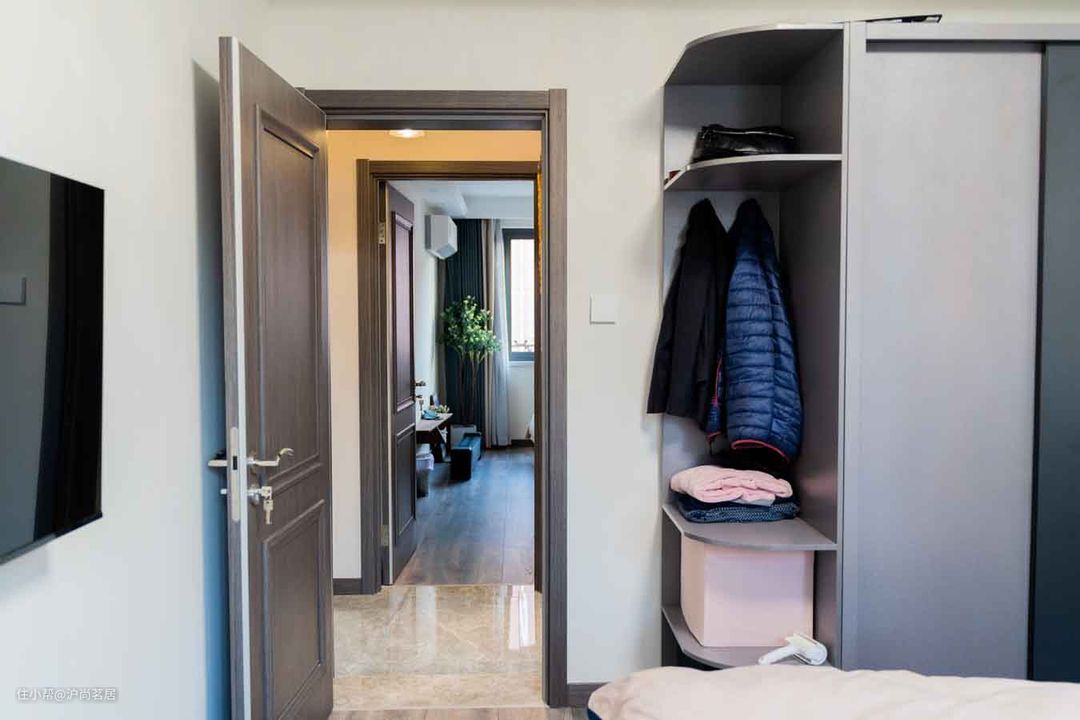 在装修上以沉稳的灰色为主,趟门衣柜外侧开放收纳区采用圆角设计,老人行动更加安全。