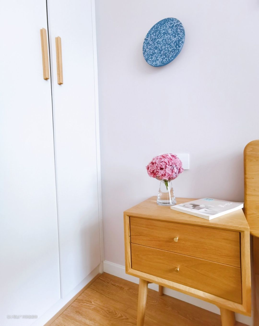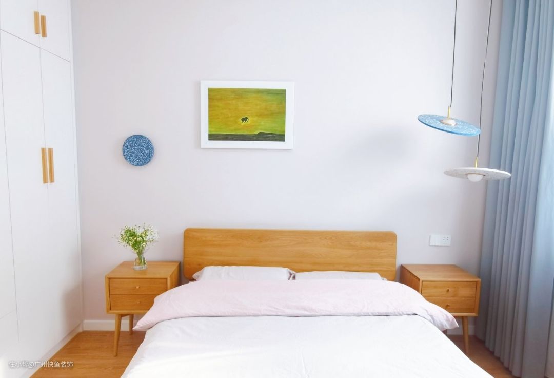 主卧的衣柜是全屋定制的,把手和鞋柜的把手一样是原木色,玄关的是圆蘑菇,卧室的是竖长条,和而不同的区分了鞋柜和衣柜。