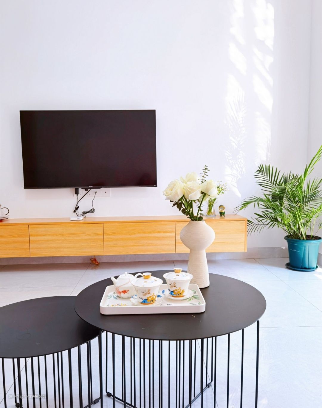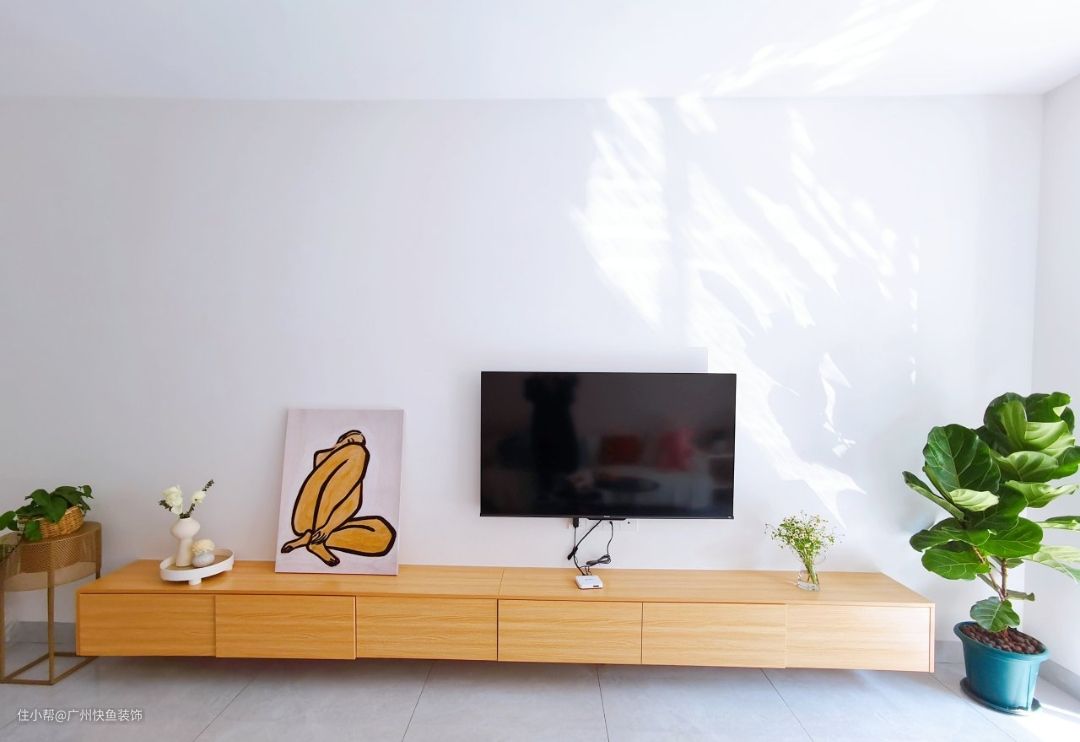 电视墙也是简单留白,因为业主不喜欢繁杂元素的堆砌,所以就是大白墙,觉得大白墙最耐看,别的电视墙容易过时和审美疲劳!电视柜是定制的,原木悬空极简电视柜,抽屉容量大增加收纳空间,也方便打扫。
