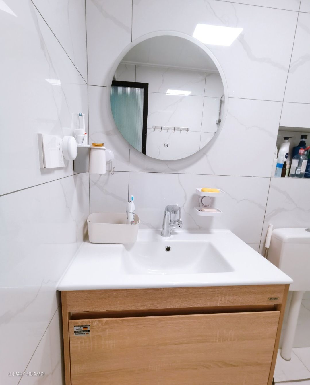 主卫和次卫都是安装了圆镜,浴室柜也是原木风格的,陶瓷的质量和光泽也很赞,台盆一体,台下盆,台上盆虽然颜值高但是不易清洁,所以还是老实选择台下盆吧!