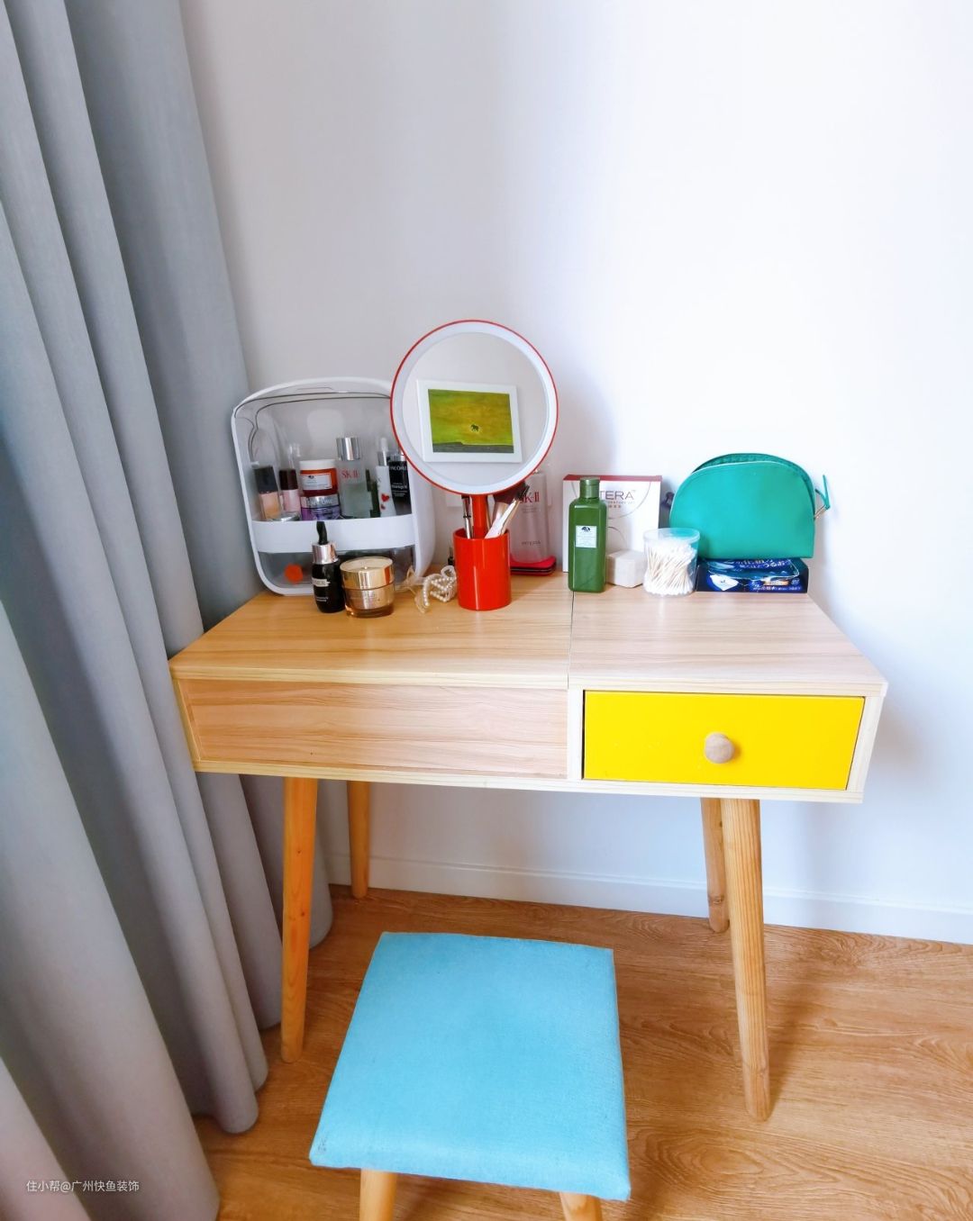 因为化妆需求不大,业主对化妆台没有太大的要求,这套桌椅也是从出租房搬过来的,没想到和卧室整体风格还蛮搭的。