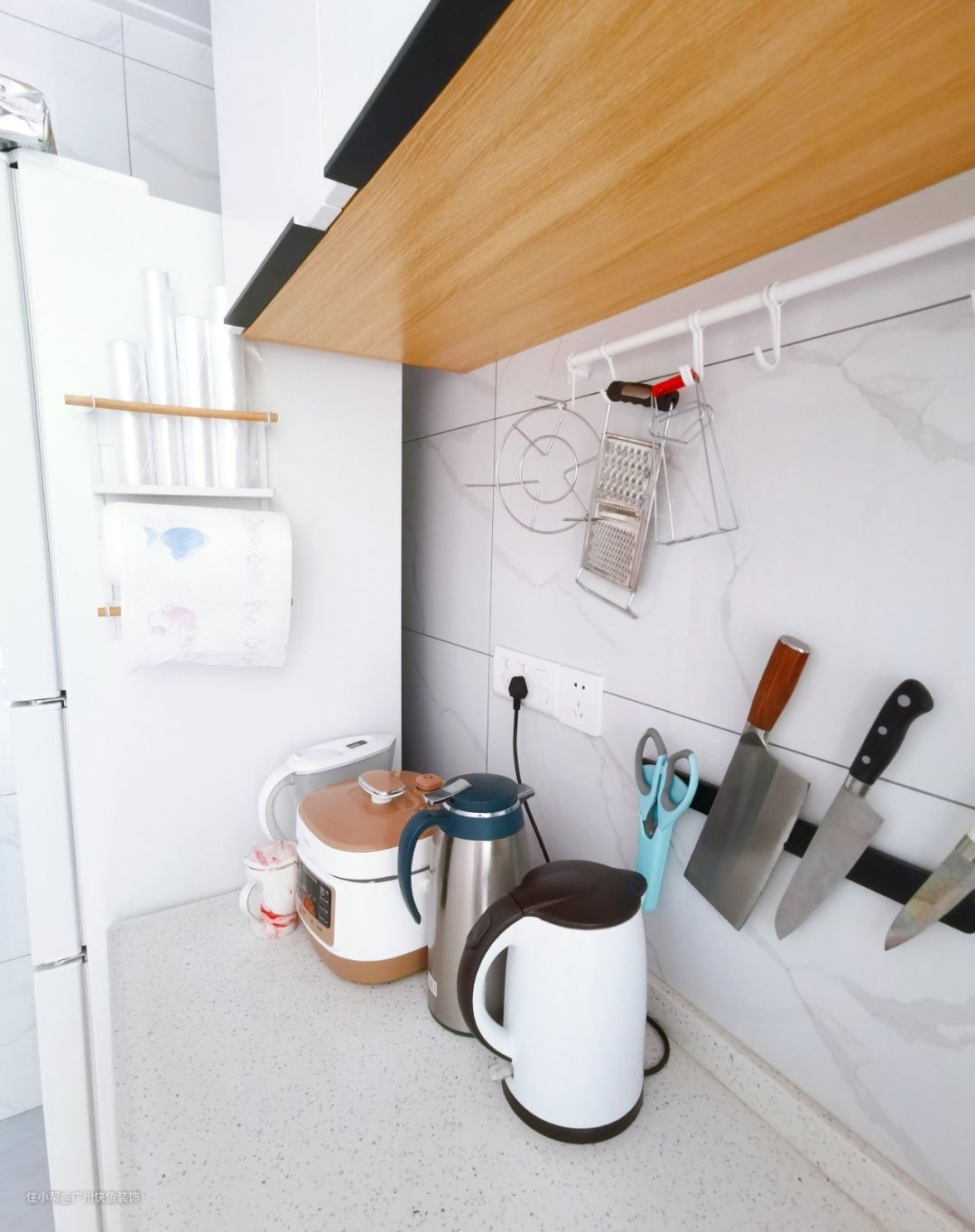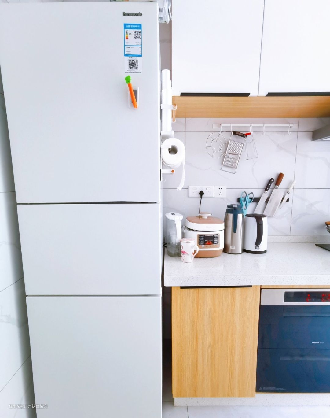 冰箱侧面粘了磁吸的置物架,放保鲜膜和厨房用纸,省空间小能手