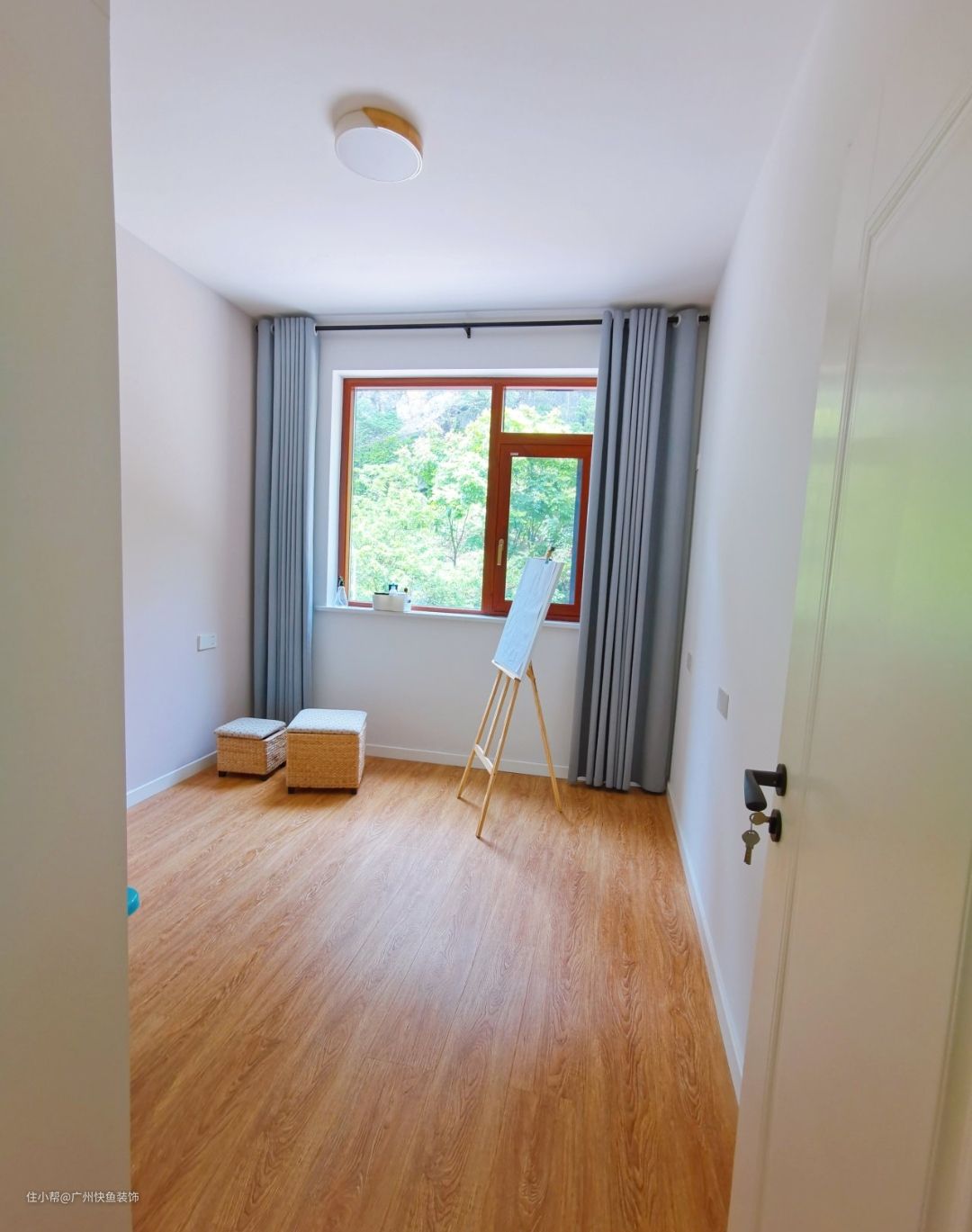 全屋的窗户都换了,卧室全用的是断桥铝的平开窗,因为业主不是很喜欢防盗网,感觉安了防盗网像住在笼子里,平开窗就完全是自由的感觉,窗景一览无余啦!窗帘选的是灰色的,质感满意!