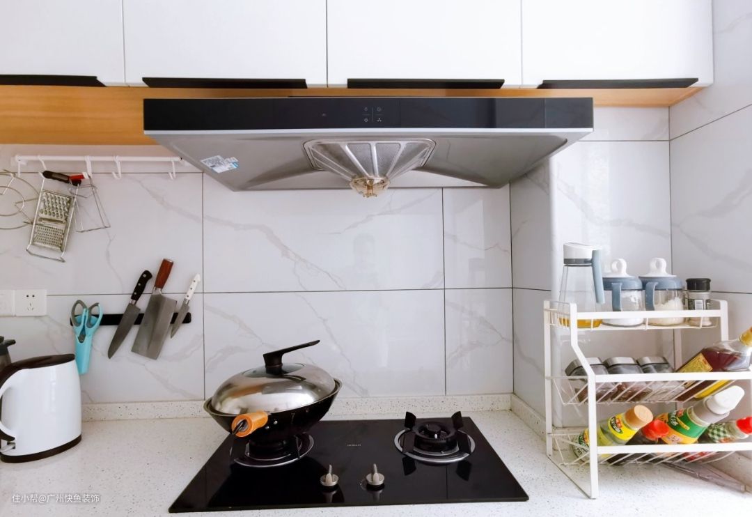 门就是鞋柜,把厨房墙抠进去做了鞋柜,鞋柜还是符合整体基调的白色,鞋柜最下面留了空,方便换鞋,这样能让玄关更整洁。