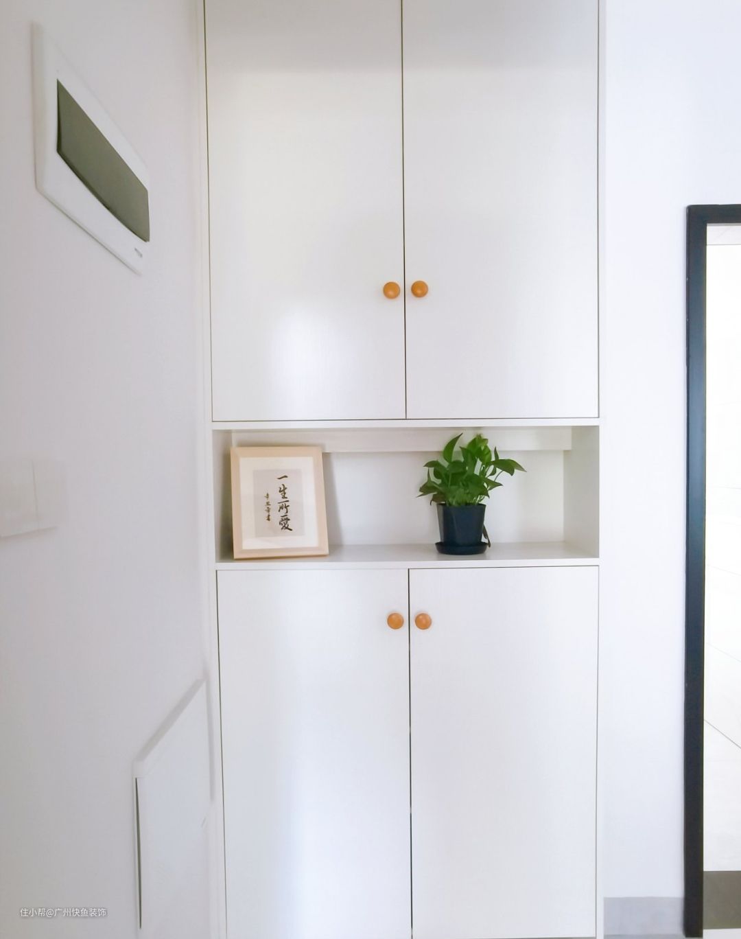 门就是鞋柜,把厨房墙抠进去做了鞋柜,鞋柜还是符合整体基调的白色,鞋柜最下面留了空,方便换鞋,这样能让玄关更整洁。