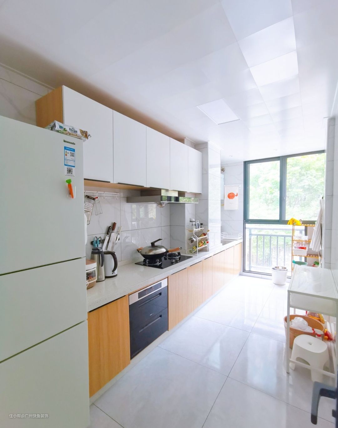 厨房还是和整体风格呼应,用了原木.黑.白的配色,厨房和小阳台打掉了隔墙连成一体了,瞬间厨房就变大!