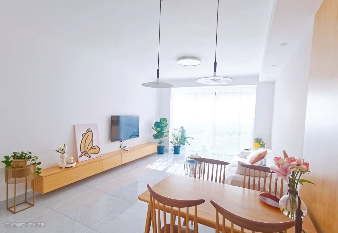 客厅是一个大的开间,光线很好,餐客一体,简单的原木风,大量留白,简单干净的感觉!吊了边顶,不占层高又可以安装射灯,吸顶灯用了极简的款式降低存在感,浅灰色地砖,整体就是很简洁的风格。