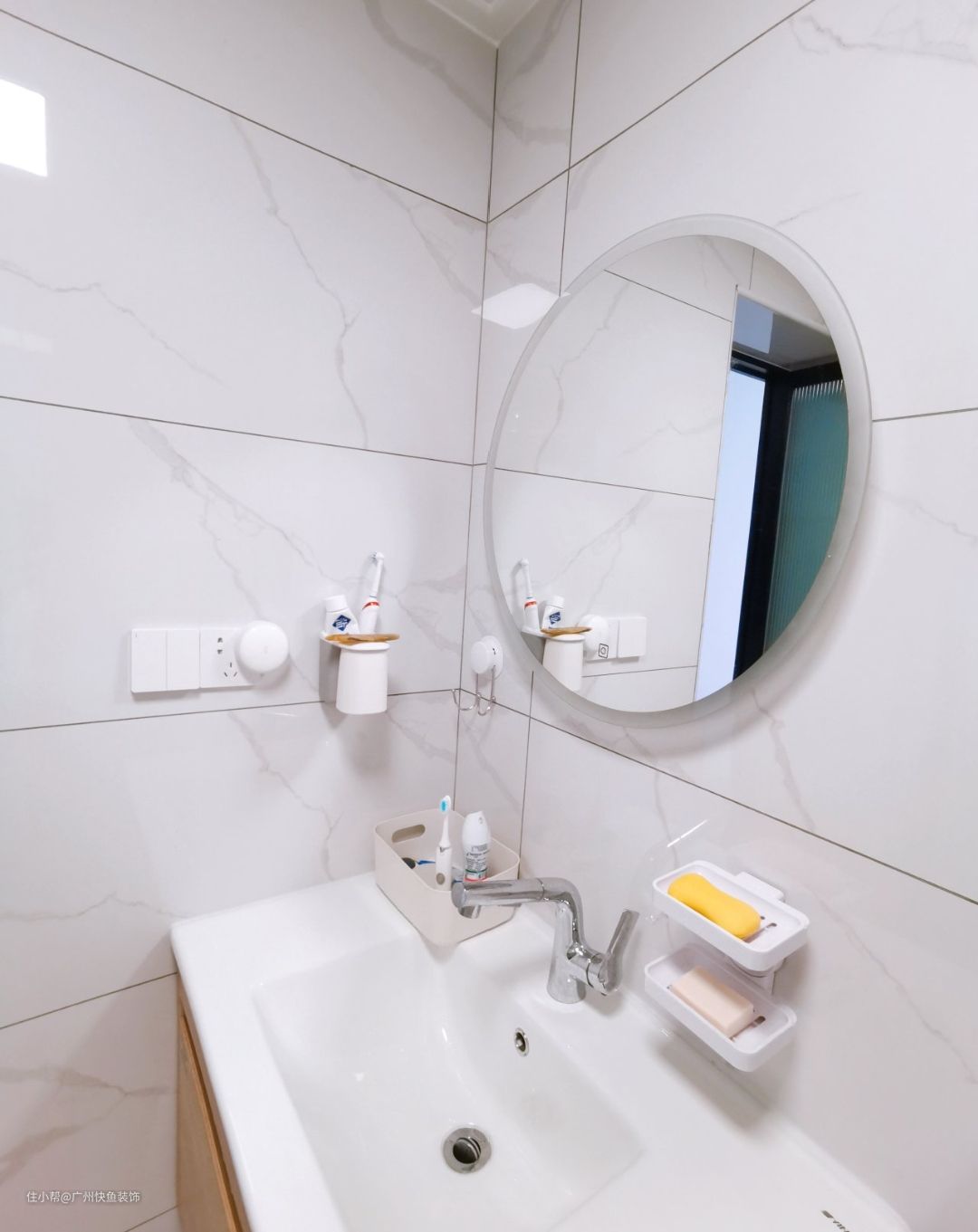 主卫和次卫都是安装了圆镜,浴室柜也是原木风格的,陶瓷的质量和光泽也很赞,台盆一体,台下盆,台上盆虽然颜值高但是不易清洁,所以还是老实选择台下盆吧!
