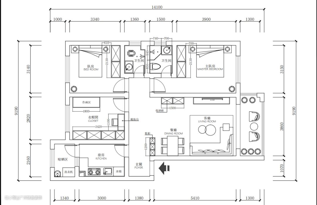 这是业主家的户型图,整体户型比较方正,三室两厅两卫,建筑面积105平,套内90平左右,整体没有做多大改动,只是把玄关和厨房间的墙抠进去了一半做嵌入式鞋柜,再把小阳台和厨房之间的墙拆了打通扩大厨房面积。