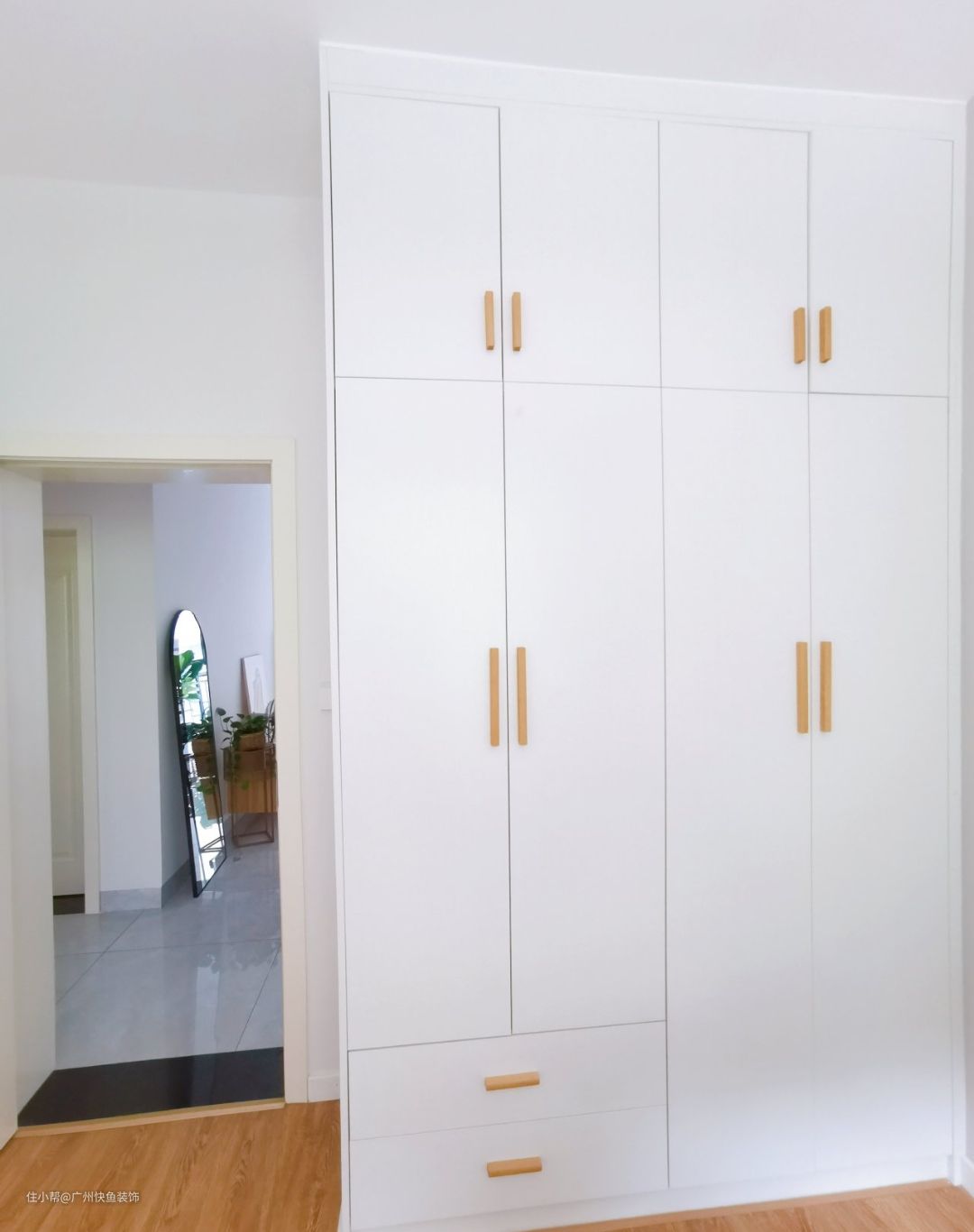 主卧的衣柜是全屋定制的,把手和鞋柜的把手一样是原木色,玄关的是圆蘑菇,卧室的是竖长条,和而不同的区分了鞋柜和衣柜。
