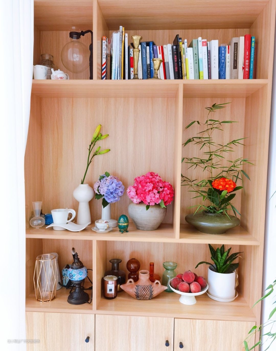 阳台一边是置物架一边是洗衣机,置物架上放了很多花器和一些小物件,最上层放书。
