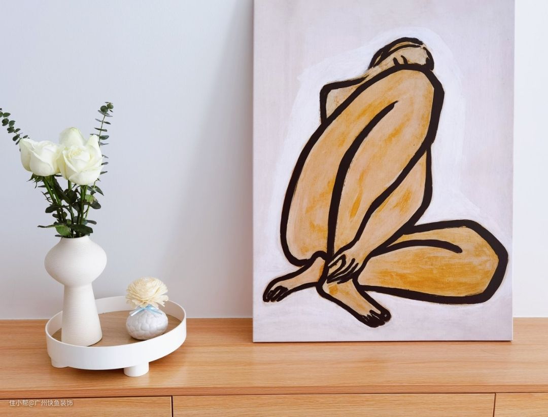 电视墙也是简单留白,因为业主不喜欢繁杂元素的堆砌,所以就是大白墙,觉得大白墙最耐看,别的电视墙容易过时和审美疲劳!电视柜是定制的,原木悬空极简电视柜,抽屉容量大增加收纳空间,也方便打扫。