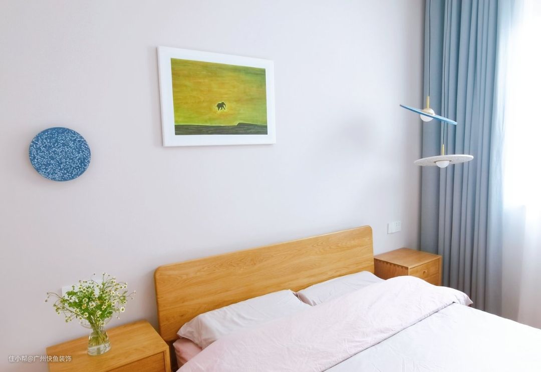 床头一边是壁灯,一边是吊灯,都是水磨石系列的, 床头的灯一开始就是打算壁灯吊灯这样不对称的设计的,觉得规矩中又有碰撞的感觉。