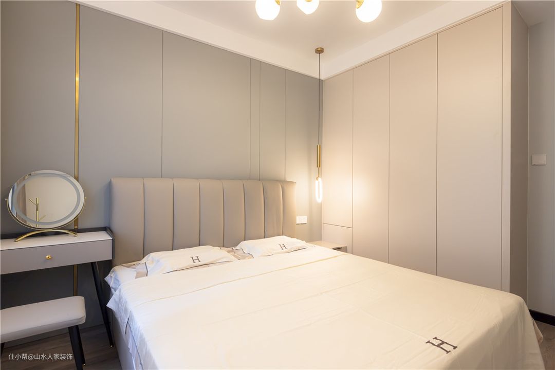 整间极致利用空间,不放过一丝一毫的闲余面积。里侧是业主淡扫蛾眉的梳妆台,精致又小巧。另一侧则是床头柜,刚好放于到顶衣柜与床体之间,不偏不倚,恍如一色。