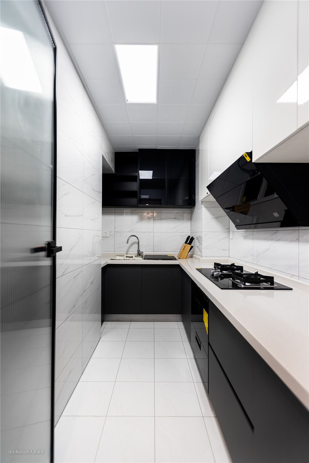 这是厨房内的洗菜区。黑色柜体搭配白色台面,呈现一尘不染的卫生环境。黑色吊柜的陈设,极佳满足餐厨的储物需求。