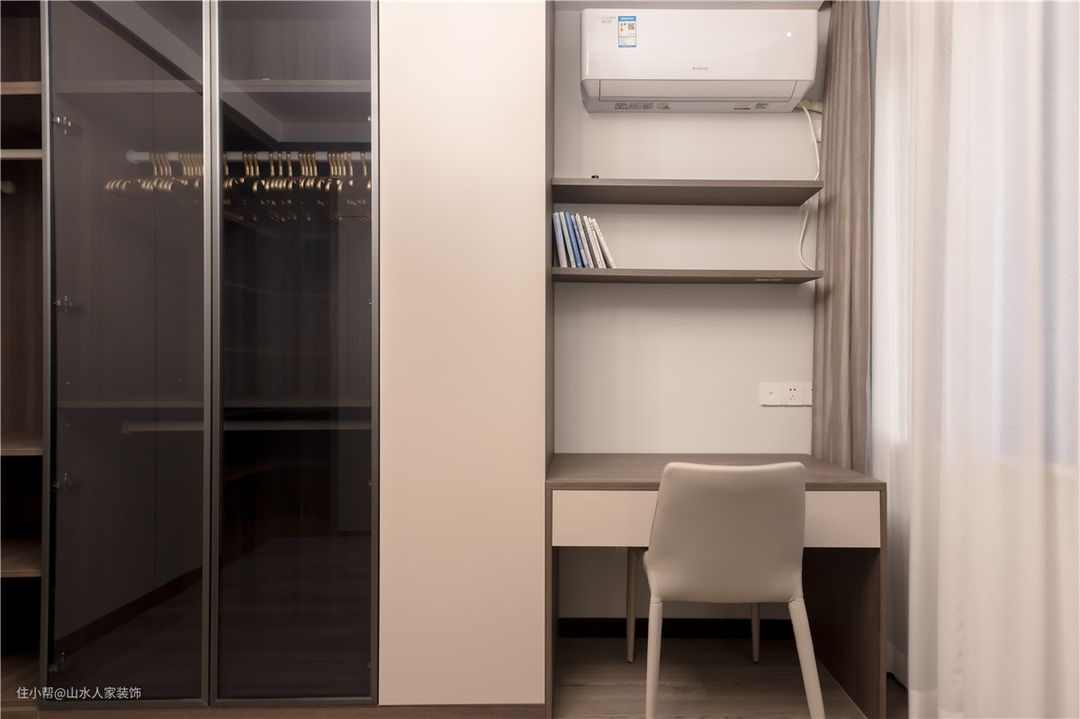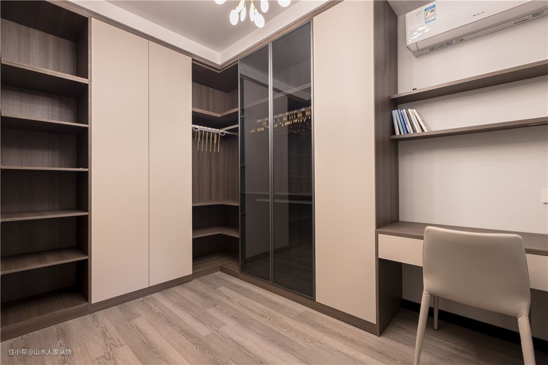 这间房算是衣帽间和书房的结合体,业主尚未做出过多安排,但整体观感还不赖。L型的棕色到顶衣柜,拥有超大的储存空间。业主心爱的衣服可以全部囊括其中,唯一担心的只有自己的衣服装不满的问题。