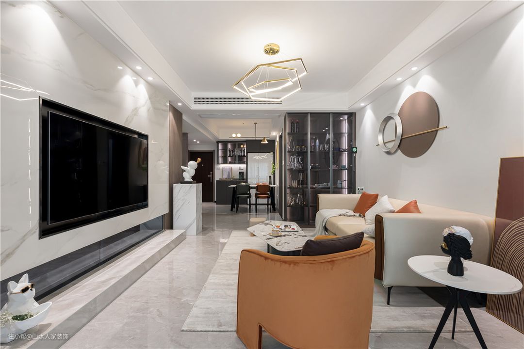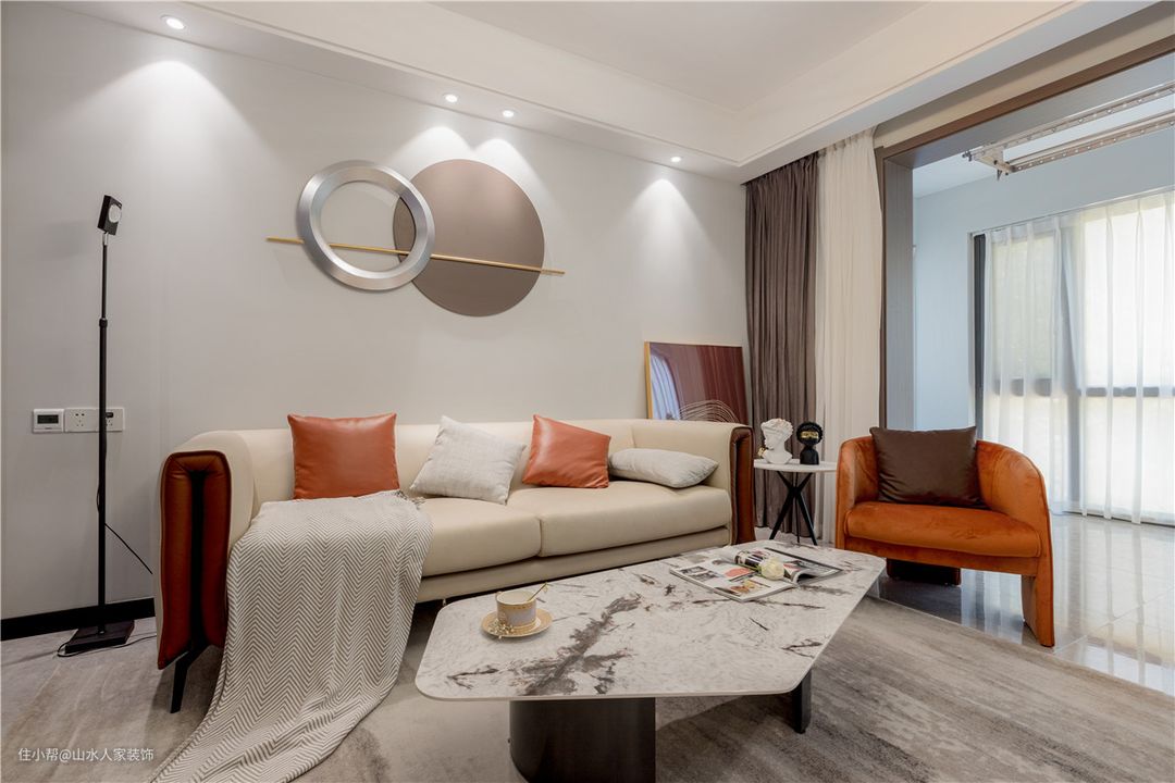 沙发背景墙用的是简单的浅色乳胶漆,上面有着连环圆的造型,凸出华美细腻的气质。浅色沙发跟墙体融为一体,同茶几的绝妙组合,精致又好看。业主还特意选购了橘色单人椅和同色抱枕,整个沙发区的亮度也显著提升。