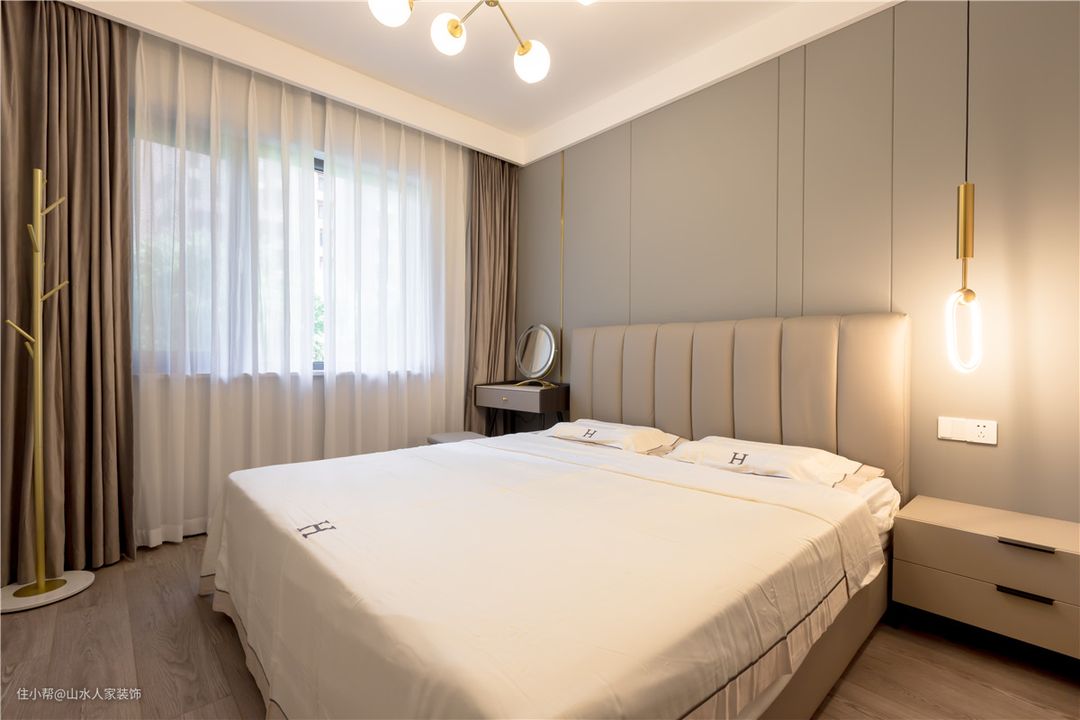 主卧整体用色偏暖色调,呈现华丽高雅的特点。在暖白色灯光的映照下,像是披上了一层薄薄的轻纱,温柔可人。飘窗即便是被纱帘遮挡,窗外的明媚景色也依稀可见。