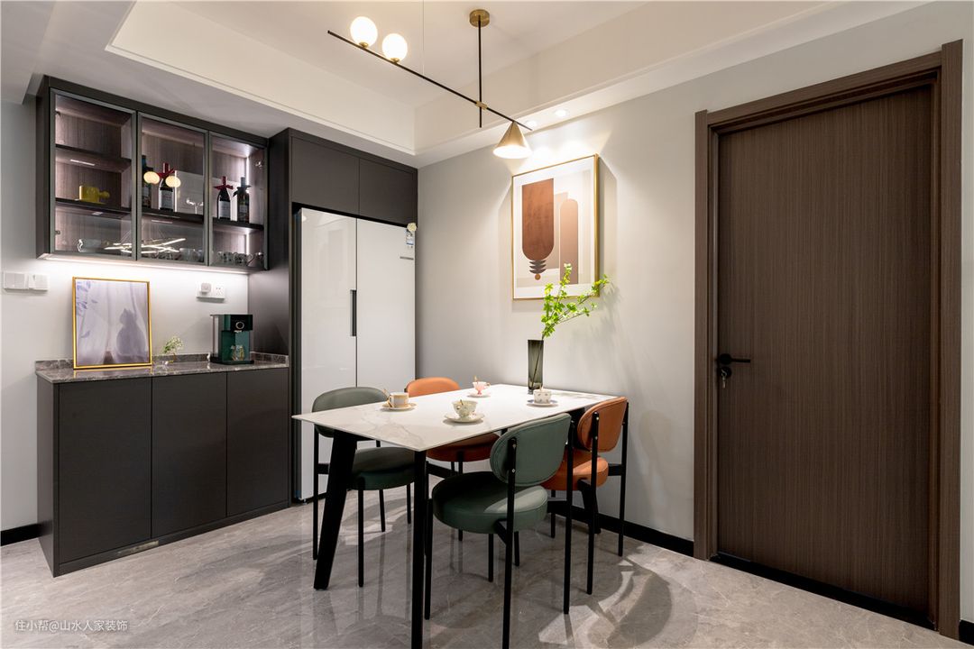 餐厅跟门厅挨得很近。全开放式的空间,稍稍移步,就能抵达客厅,且拥有极佳的视野。以侧面黑色立柜为界,有效地隔开客、餐厅区域,动线非常流畅。