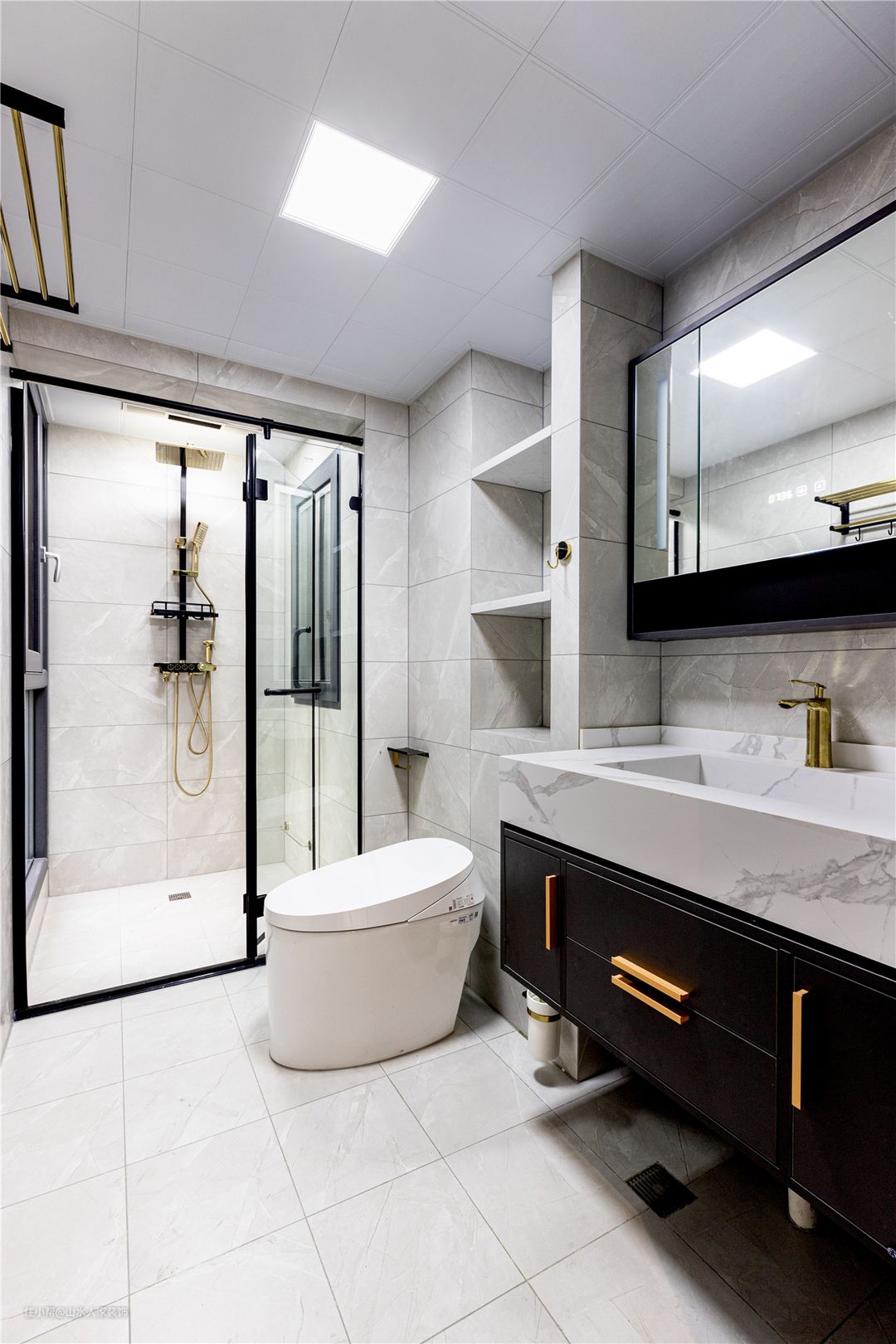 卫生间通过合理分区,有效实现了干湿分离。背景墙用的是白色墙瓷,跟浴室柜的鱼肚白台面相互照应。一整套黑色浴室柜+镜柜的组合,在金色配饰的应衬下,更显一分精致。