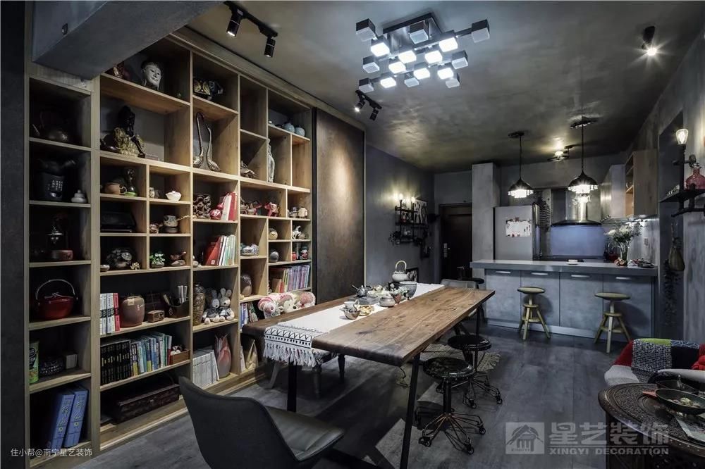 在主色调为黑灰的空间里 形状各异的小摆件几乎塞满每个角落 别具一格的水龙头搁物架 精致古朴的小茶壶 趣味可爱的小多肉…… 强大的收纳设计和物品搭配 十分契合业主喜欢品茶和收藏的爱好 也给整个空间增添 神秘复古、雅致炫酷的气氛