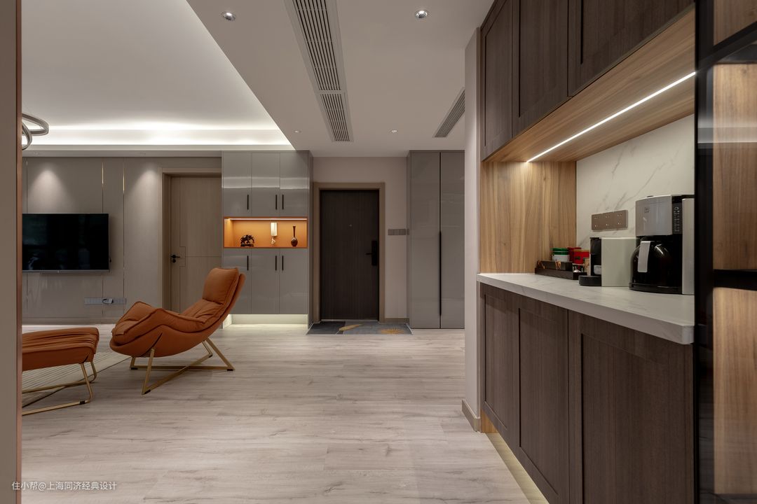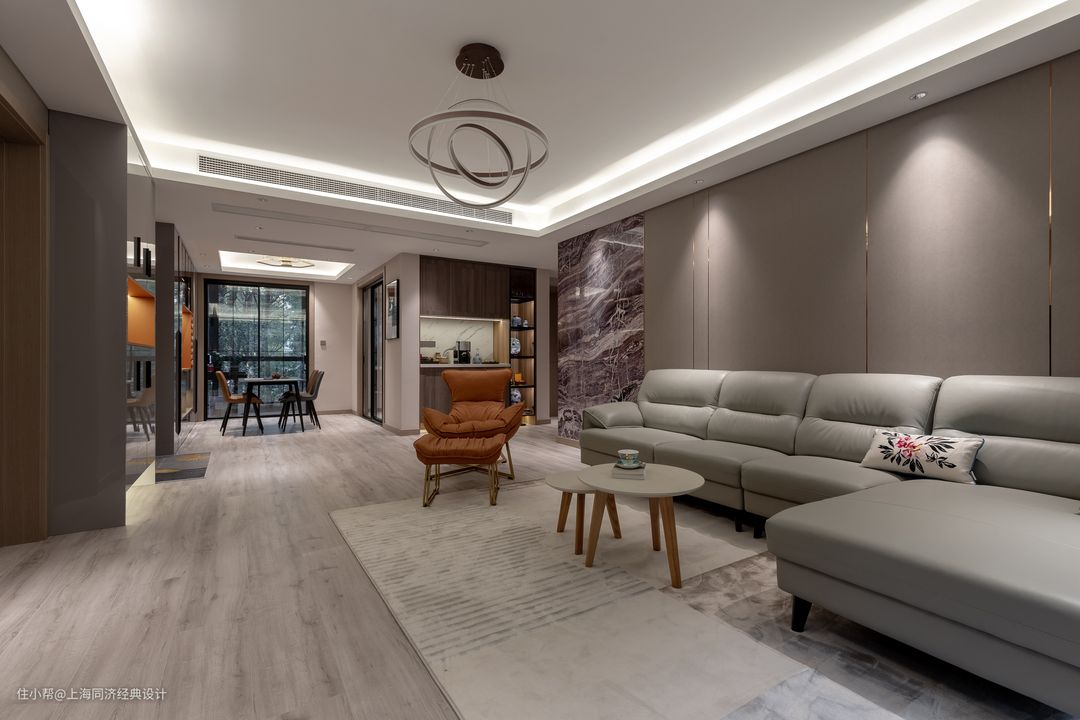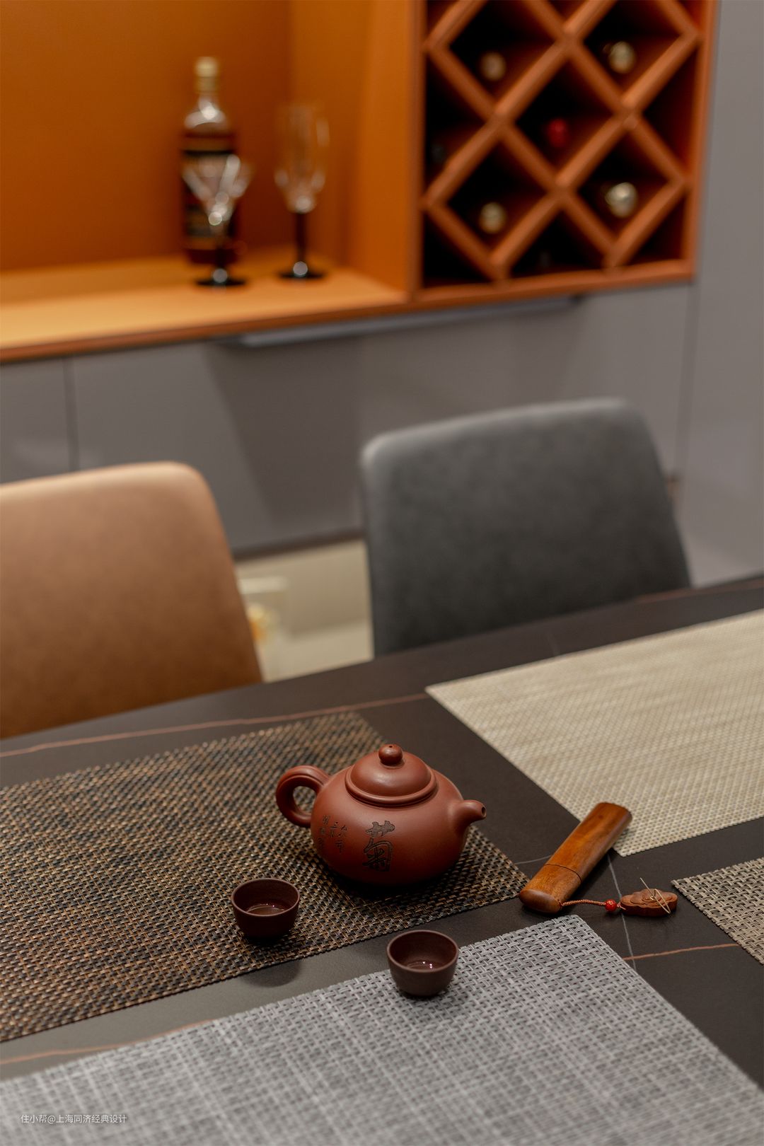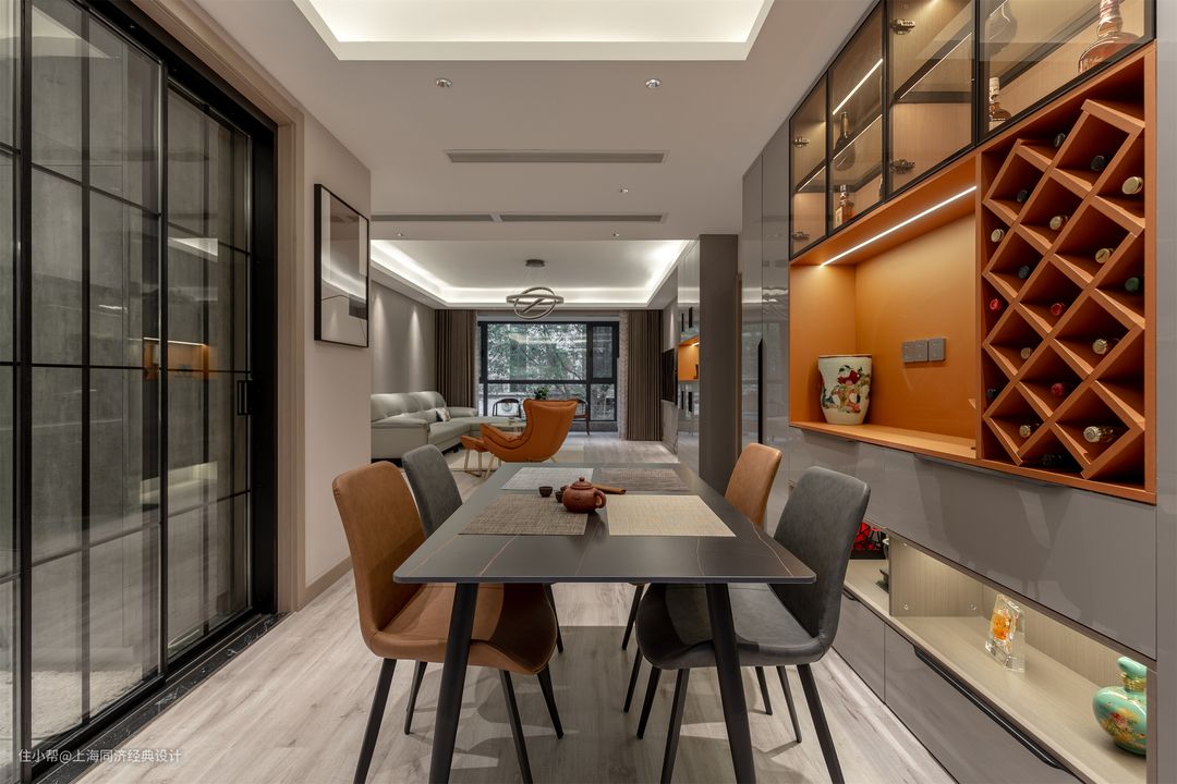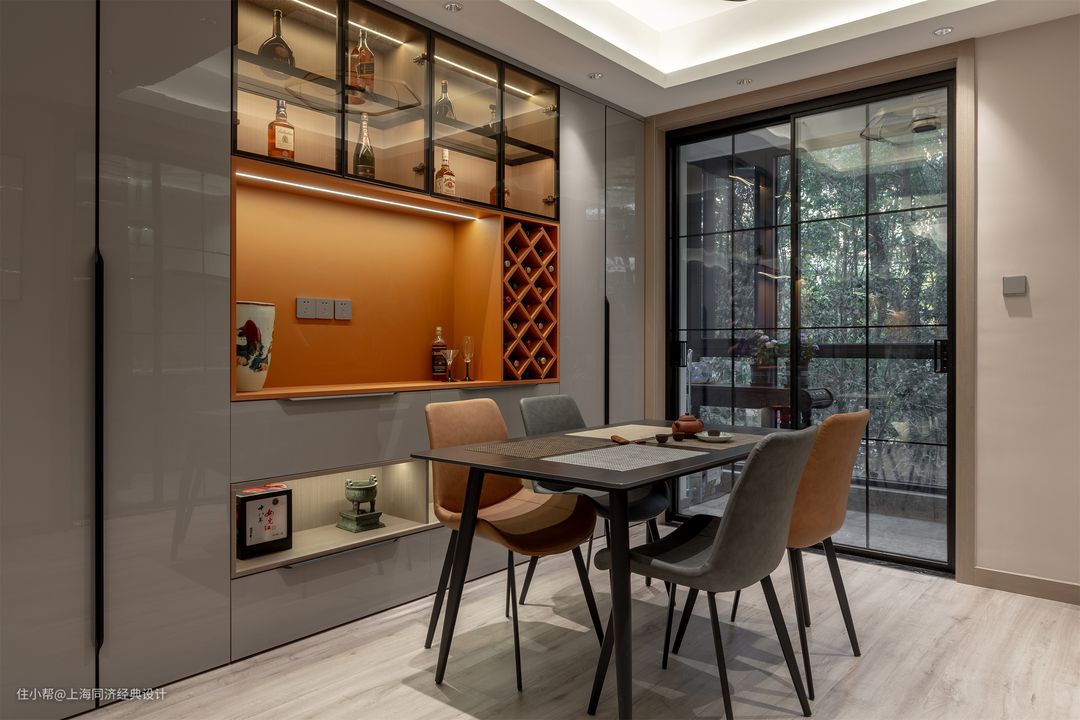 餐厅整体色系灰色系为主,其中点缀的爱马仕橙,给黑白灰的空间释放出活泼自然的气息,让现代简约体现得淋漓尽致。