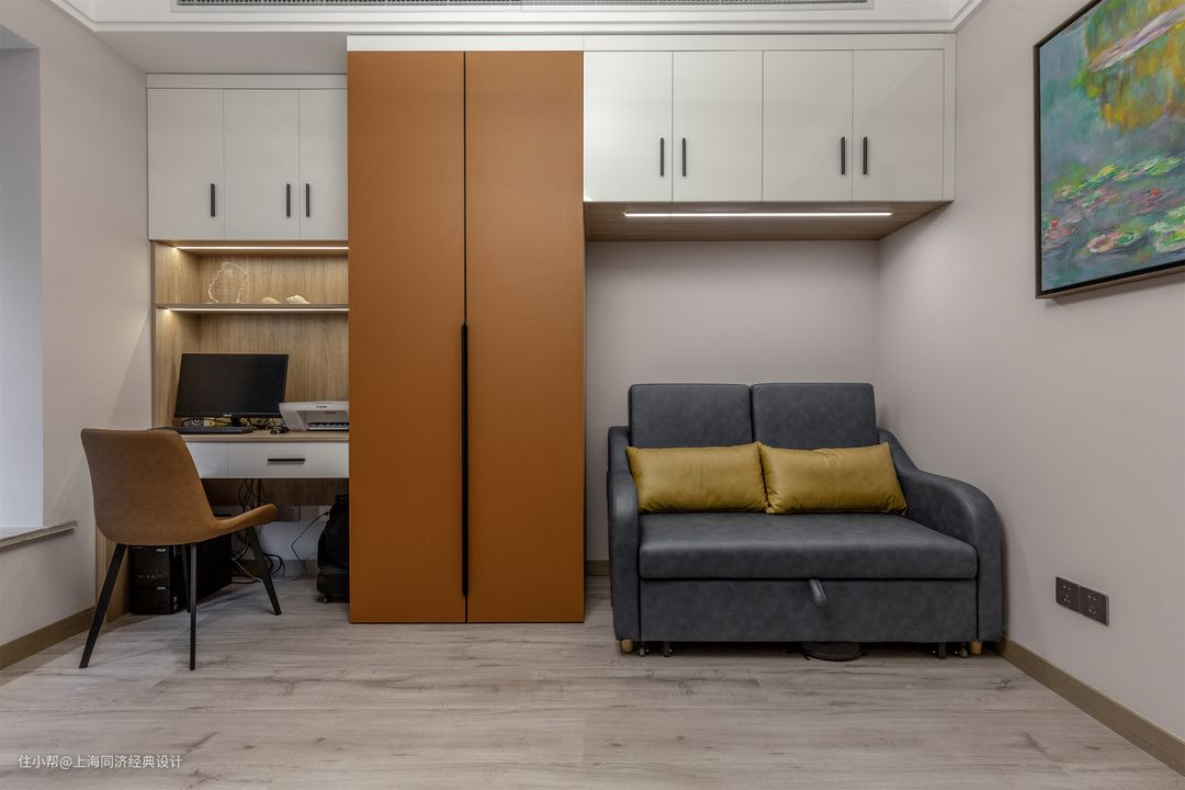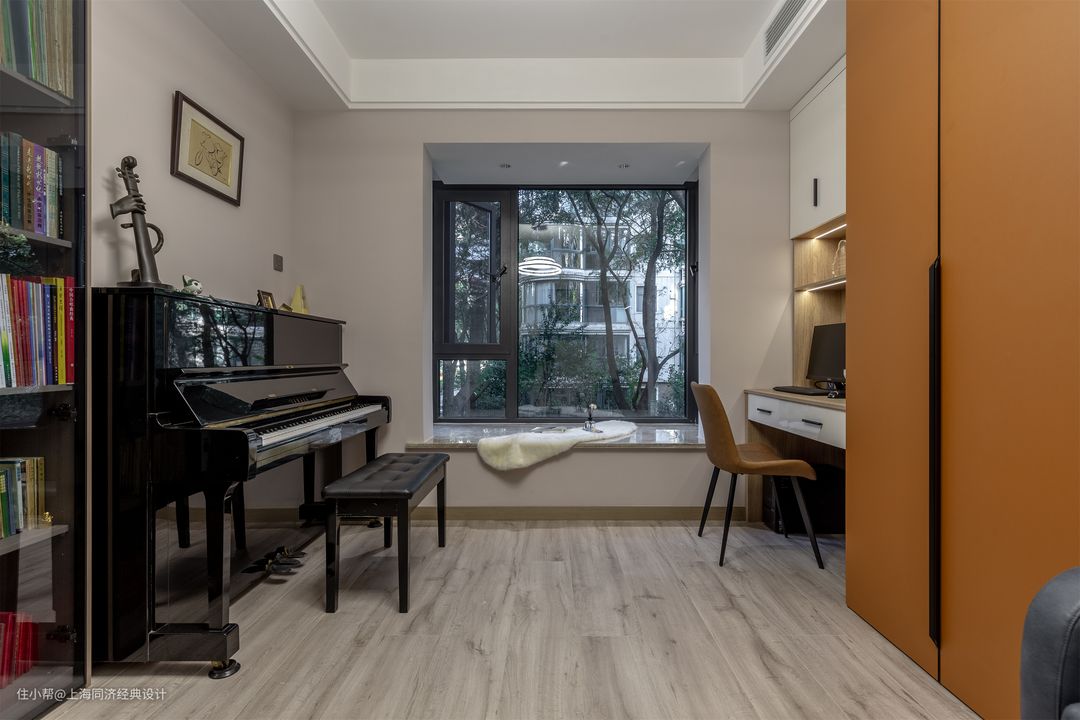 北房间是多功能房,摆放着一体书桌,钢琴,沙发床、收纳柜,在这里研究乐谱、或者偶尔弹着琴来一首《一起向未来》,是属于屋主内心的小天地。