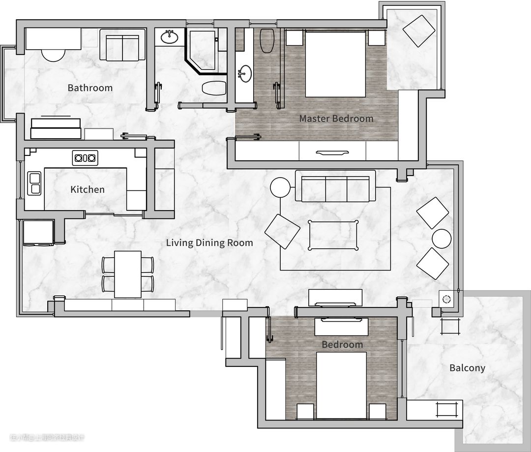 ①:主卫取消浴缸区域,扩大主卧面积,增加主卧收纳空间。 ②:阳台与客厅之间打通,但各自保留独立性 ③:过道墙面增加嵌入式收纳,提供整体空间收纳力 ④:将次卧开门内移动50㎝,完美避开玄关门直对卫生间的尴尬