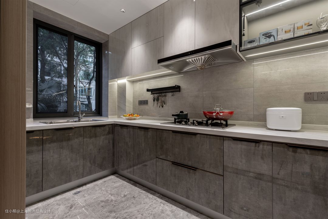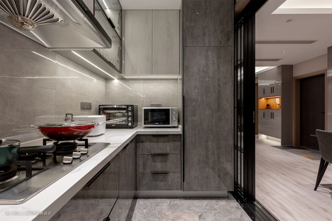 厨房是最有烟火气的空间,以一扇细框玻璃推拉相隔,二次装修后扩大了收纳空间,将蒸烤箱电器柜的位置,大件的厨房用具均可收纳进去。