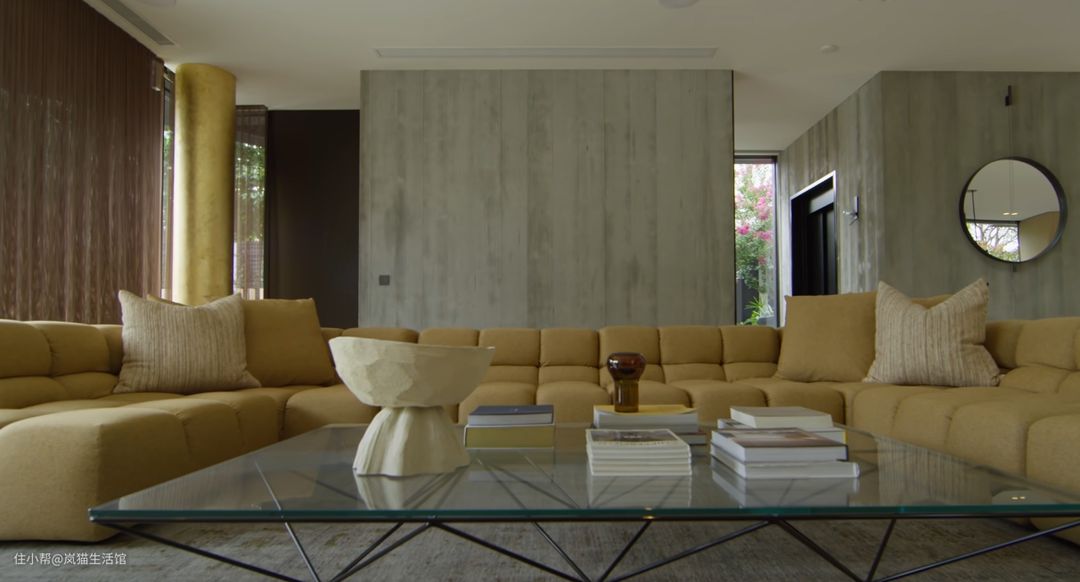 客厅整体做的是一个工业风装饰,淡黄色的沙发配上灰色的水泥墙,整体看上去形成一种强烈的视觉感,玻璃制的茶几也还原了工业风的一种美。