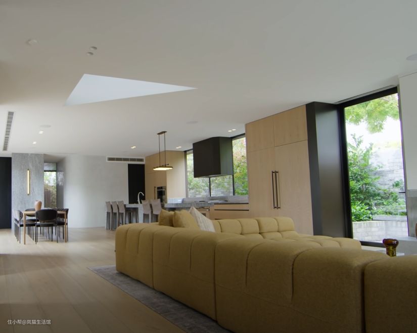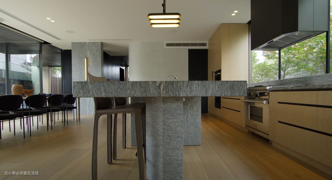 厨房选择的是一个开放式厨房,原木色的橱柜还原了生活气息,水泥制的岛台也表现了一种工业美。