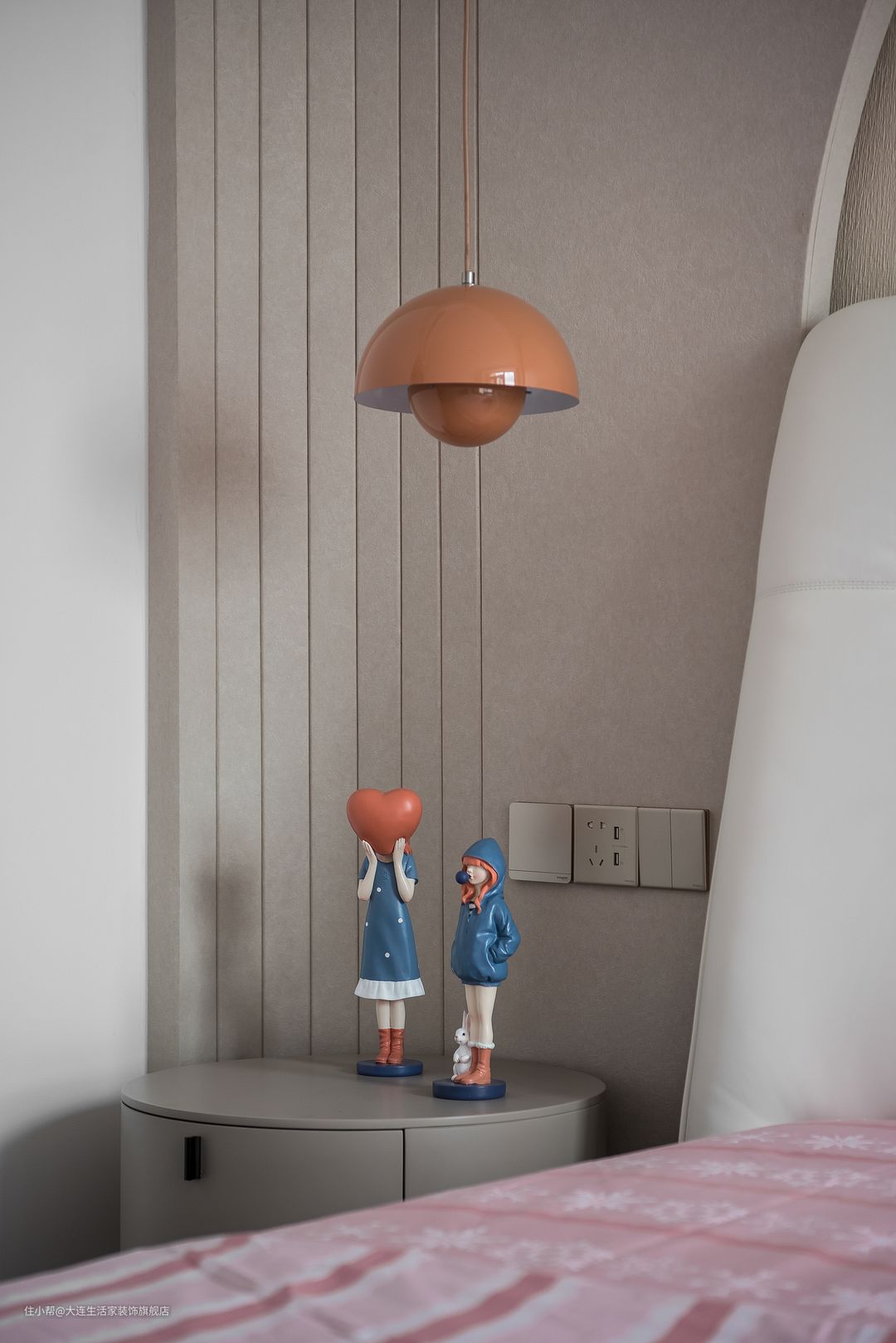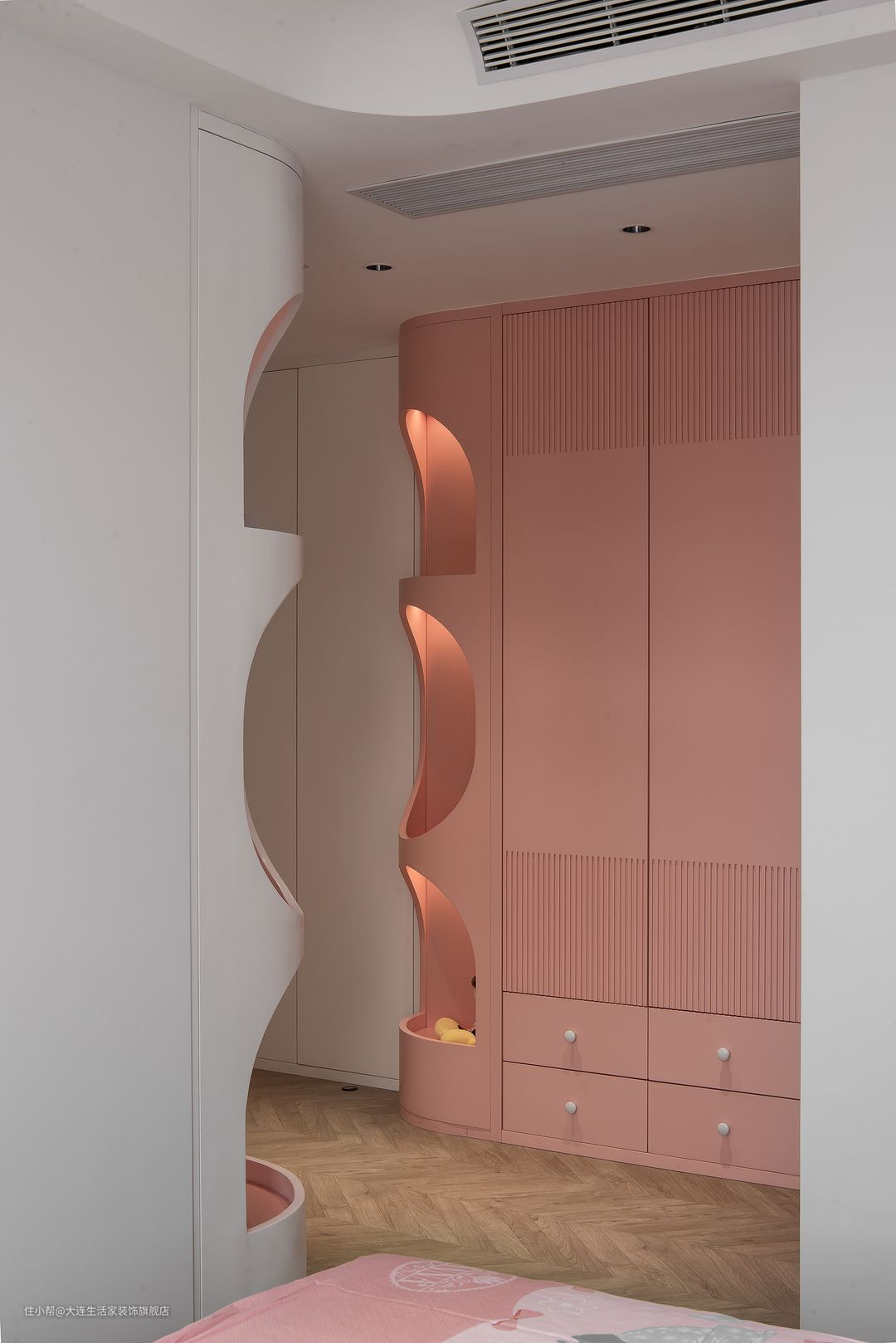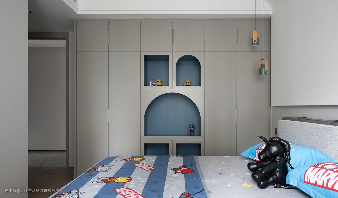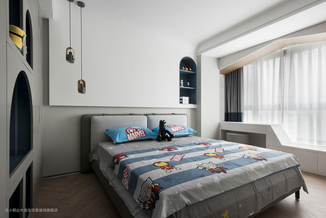 儿子房以灰色调为主,和女儿房异曲同工之处是各种弧形、线条的运用。原本单调的卧室充满了童趣感。
