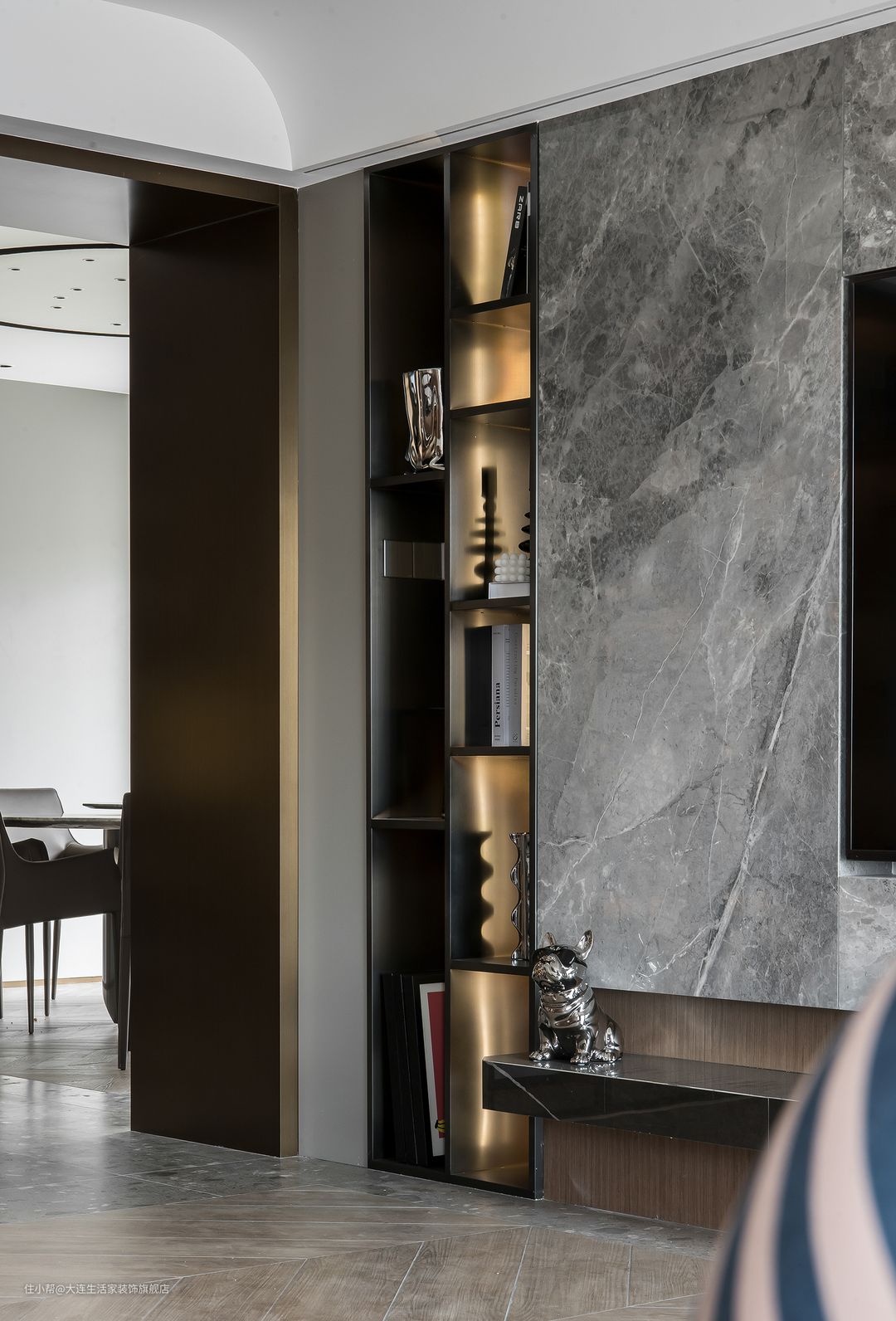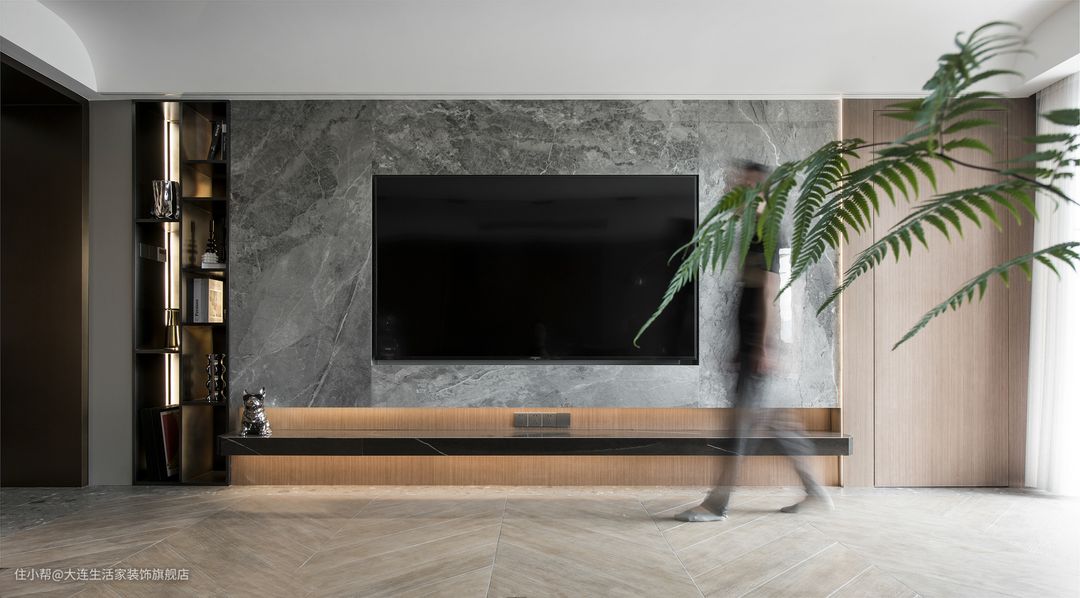 客厅沙发背景墙由两种材质拼接,不对称的设计,很有高级的感觉。电视墙选择的男主人喜欢的大理石,左侧做金属置物架,右侧安排隐形门,电视台非常推荐这种墙面一体式的,好清扫,特别省心,同样的材质也显得大气。