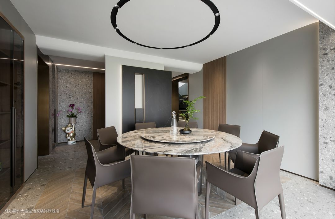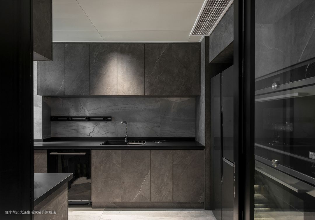 深色系厨房干净利落,更好打扫。拒绝了俗气和普通,大理石纹的磨砂橱柜门中和着烟火气。